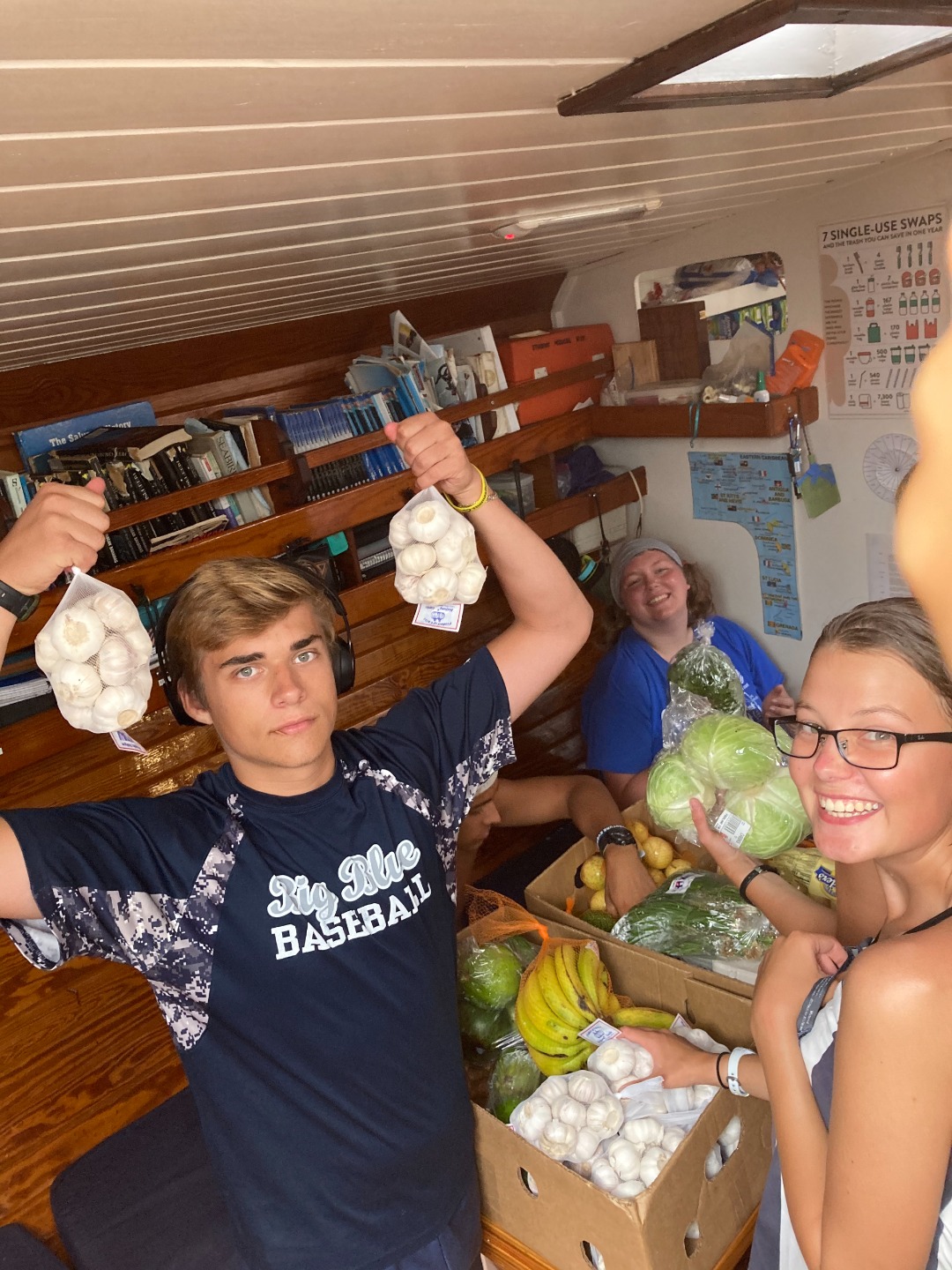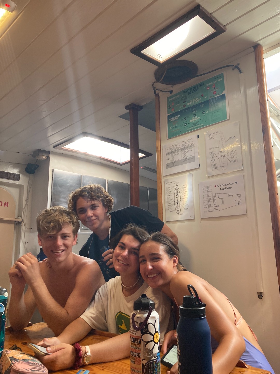 For dinner, Chef Luke and his sous-chefs, Will and Sophie, prepared us a nice pasta dish. All day today, they were working with limited provisions, but they made great meals despite the challenge! Everyone was chatting away and enjoying dinner while I decided on my question of the day. I decided to ask everyone to say something that they appreciate about the people who were sitting next to them in the circle. Everyone had really nice things to say about each other, and it was amazing to hear all of the wonderful qualities that everyone noticed and admired about their shipmates.