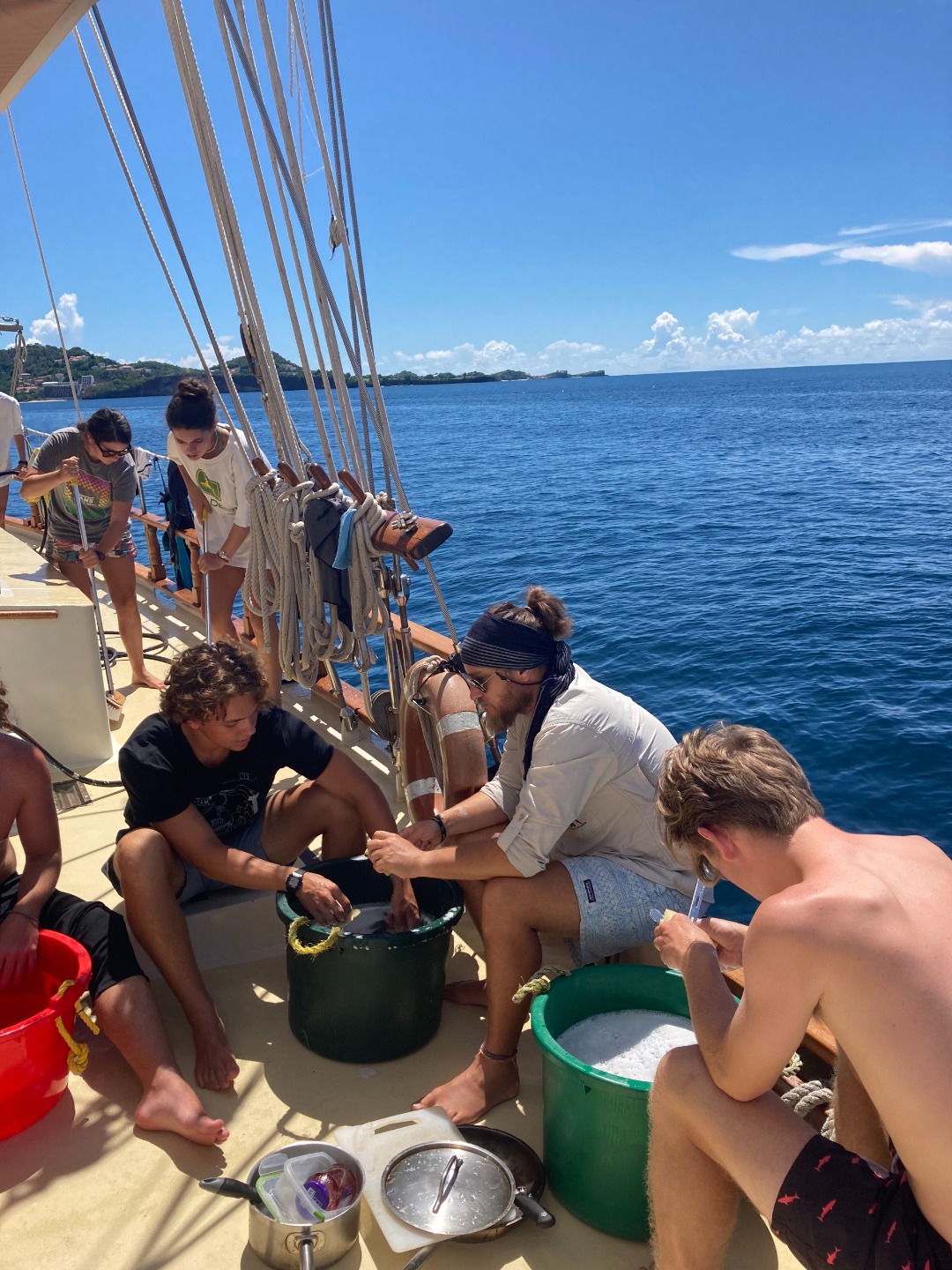 Picture 4: Salties washing dishes and deckies scrubbing the deck
