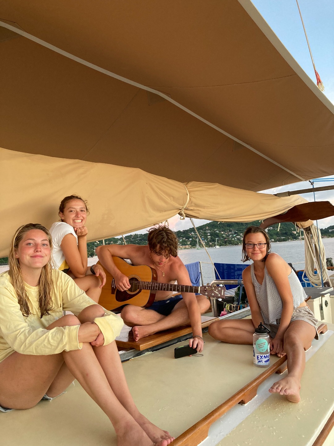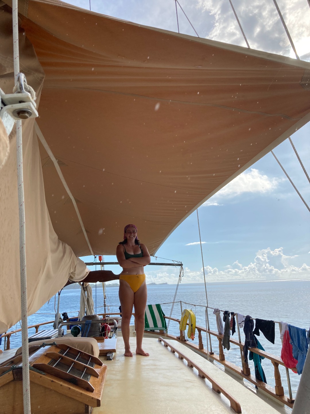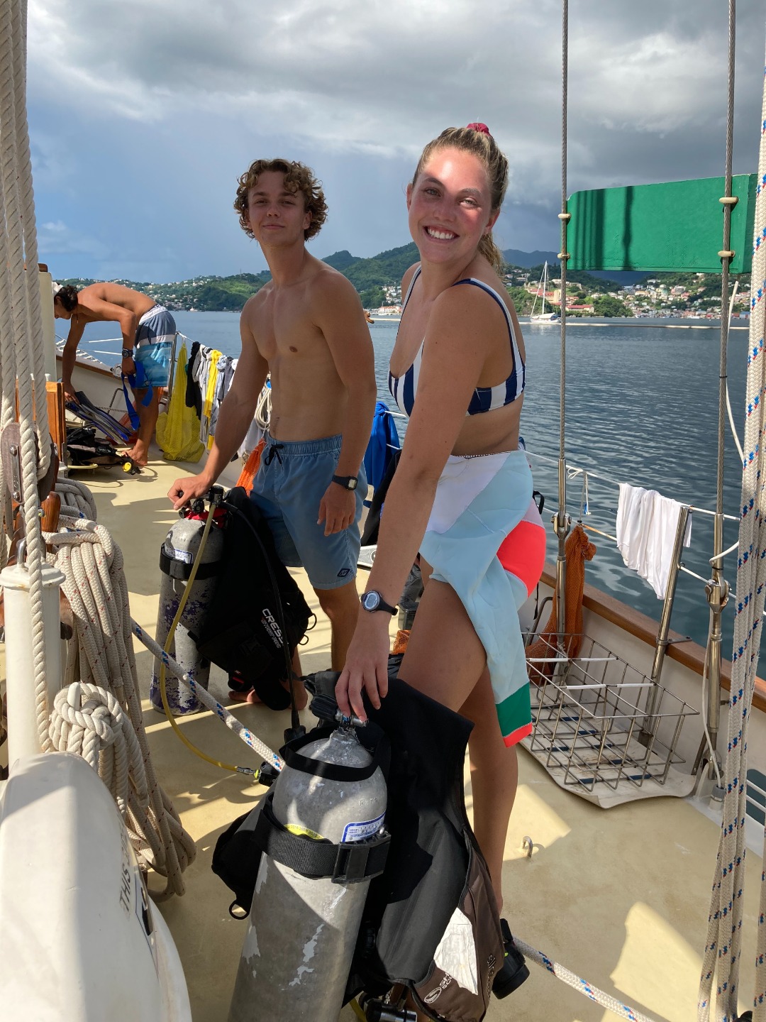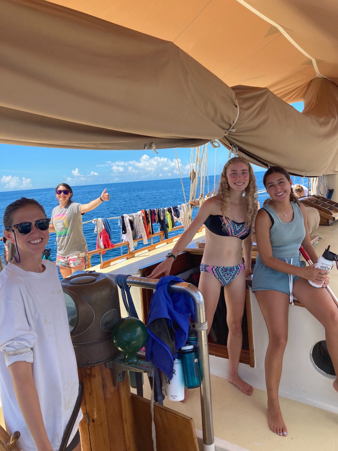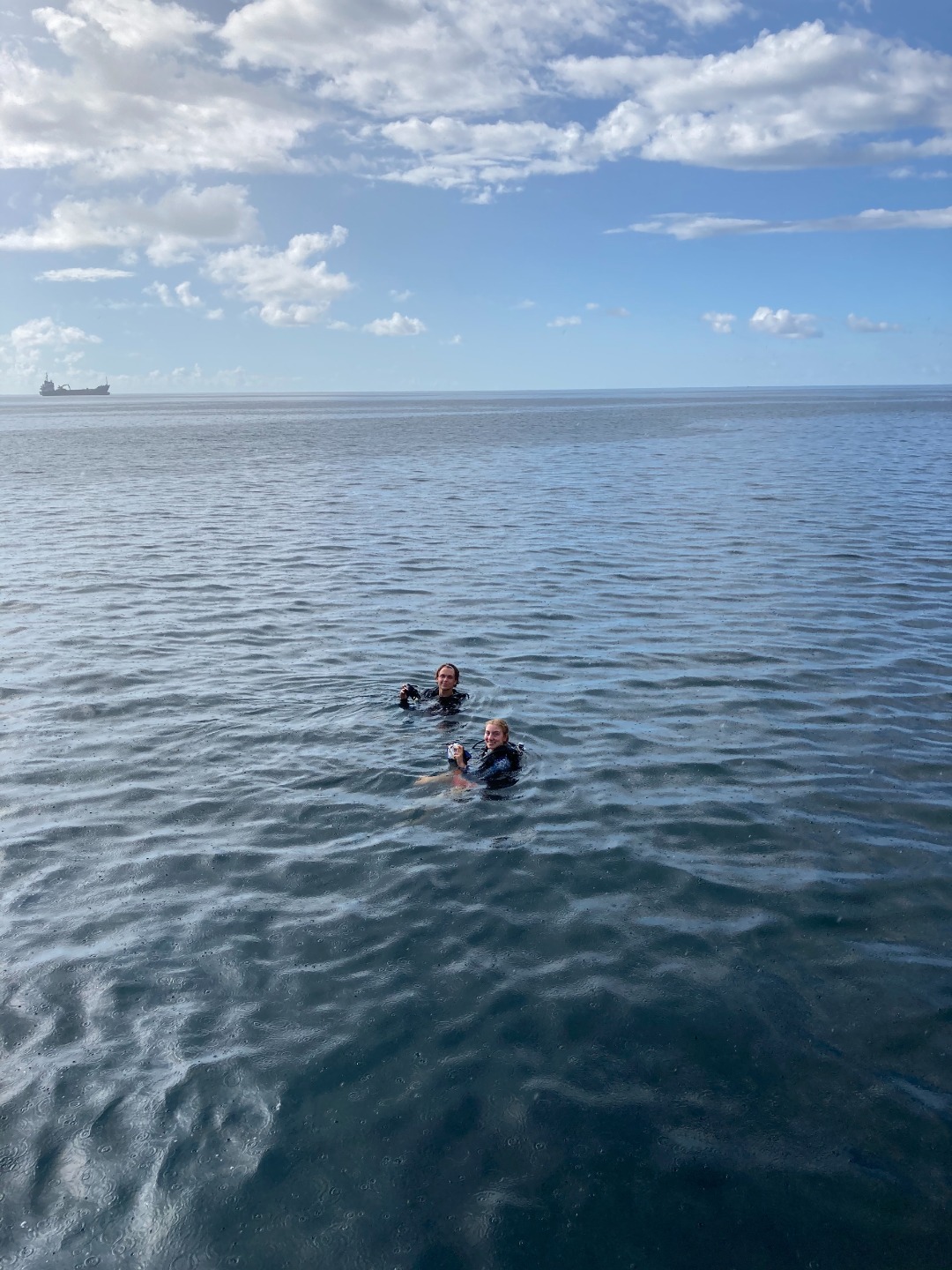 This morning we woke up, once again, to a calm and sunny St. George Harbour. For breakfast this morning, we enjoyed some yogurt and granola with a little bit of frozen fruit. Then, it was time for me to announce the schedule for the day…. which I accidentally forgot to get from Steve before breakfast. He told me to wing it and that he would either confirm or deny what I said. This was much harder than I thought it would be. I guessed all of the wrong classes and activities in the wrong order, and everyone got super confused, but we had a good laugh about it (per usual). After about 5 minutes, everyone was informed that we had leadership after breakfast, so we all split for clean up (which is becoming more efficient each day) and then headed to the salon, where Sophie led a great class discussion. Leadership was followed with a deep dive for half of our advanced divers. It was pouring rain, but the divers set up their gear with huge smiles on their faces and jumped right into the water. The first batch of divers went down to almost 80 ft deep, while the second batch of divers, who dove after lunch, experienced a couple of cases of Gas Narcosis. Gas Narcosis sounds scary but is actually pretty hilarious… Lenox (known on the boat as Xonel) and Ruth-Riley both experienced this phenomenon but had no clue. While they thought everything was normal on their dive, they were actually acting slightly, to put it simply, drunk. Based on what I heard, Xonel could not count to 20 and slapped herself in the face with her SPG while Ruth-Riley looked lost the entire time even though she was surrounded by the rest of the group. Anyway, the second group of divers were all cracking up when they resurfaced, and it put a smile on my face to see them all so happy and entertained.