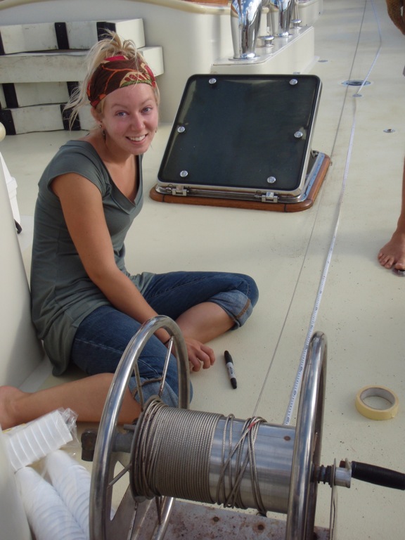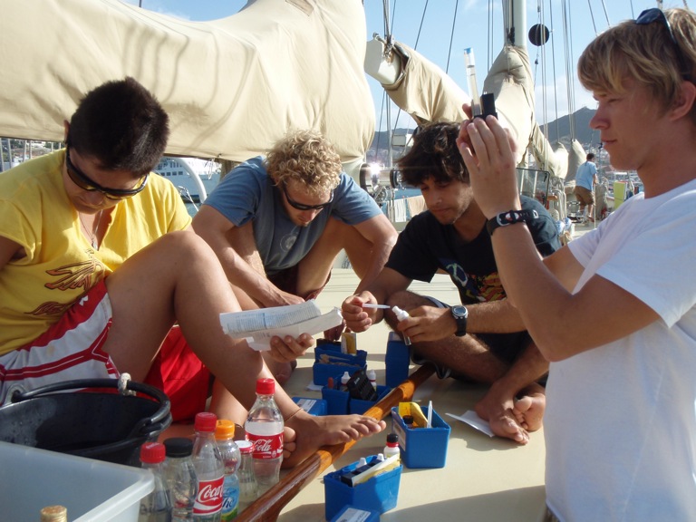 After wake-ups at 7:30 and oatmeal for breakfast, the crew got several hours to work on our oceanography projects. Students checked hypotheses, measured trawling liters, counted lures, took water samples, and collected algae off of the hull. Microscopes, refractometers, fishing lines, and CTDs were scattered all over the deck, and for a while, Argo was a fully functioning marine lab. Lunch was grilled cheese sandwiches and tomato soup, a favorite meal for many of the crew. Around one o’clock, we were told that our stay in Cape Verde would be one day shorter and that we would be setting off the next morning for the biggest test of our trip: the Atlantic crossing. Everyone grabbed computers, postcards, and all the local currency they had, and we set off in the dinghies for shore. With the afternoon to prepare ourselves for the crossing, many spent the first-hour finding the internet to send out last-minute emails and check Facebook once more. For some aboard, two weeks without Facebook sounds like social suicide. After the internet, most of us found our way to the grocery store to spend every last bit of local money on cookies, wafers, cereal, and other snacks to stave off the hunger that hits on the 3-6 am watch. Fortunately, most things in Cape Verde are pretty cheap, so most were able to buy enough to last the 14 days. Dinner was a good tuna-noodle casserole and was followed by a nighttime MTE class on electronic navigation aids, which is good stuff to know about before crossing an ocean. After class, many 40/40d their bunks and enjoyed the last night of stable flooring. Everyone is excited for 14 days at sea and is looking forward to the sighting of St. Lucia, 2100 nautical miles west of us.