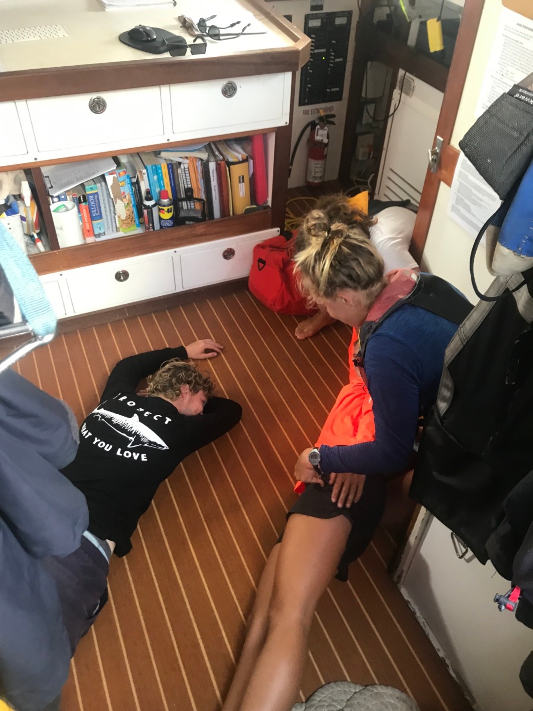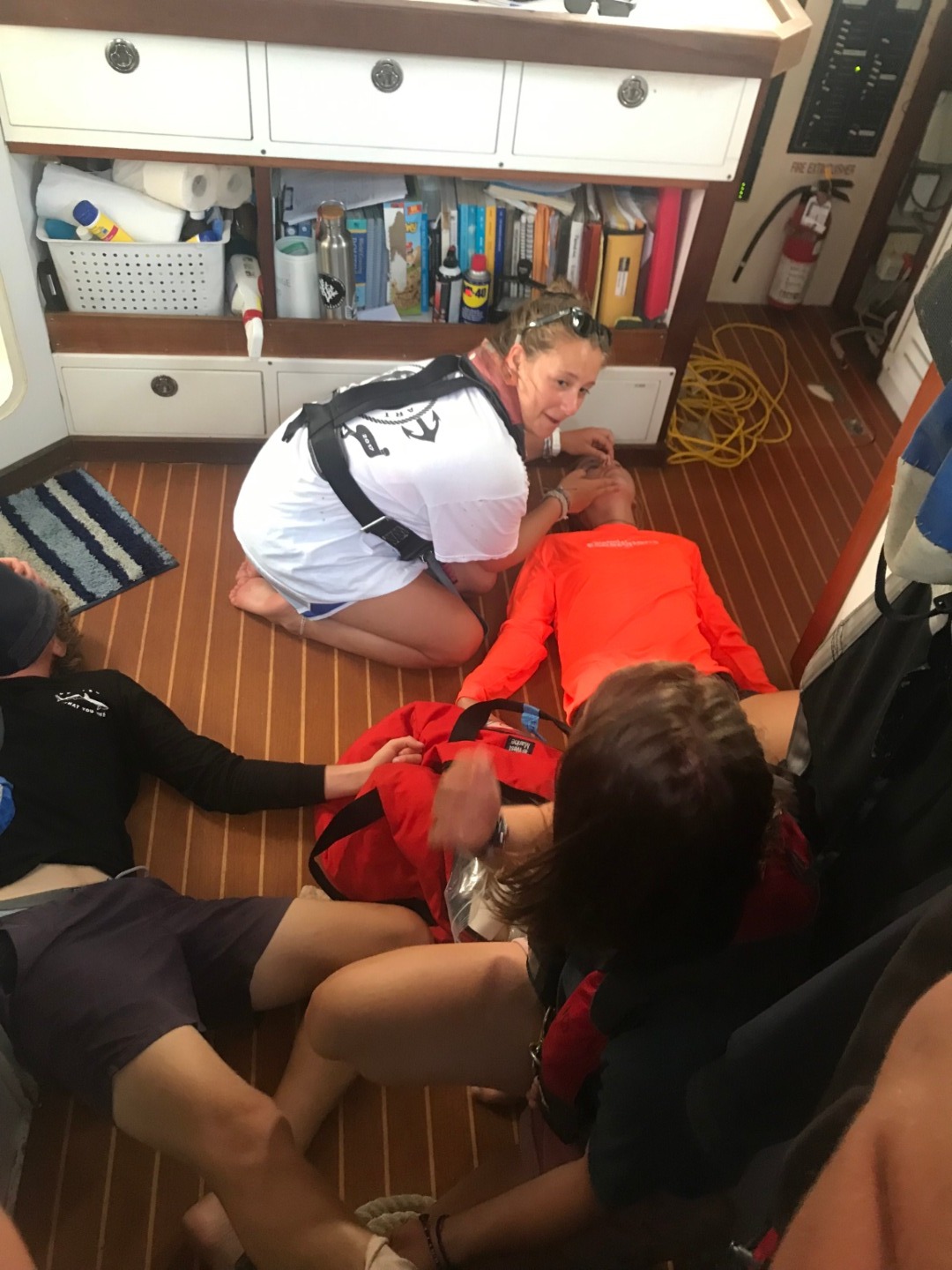 Finally, we ended the day with our last test to become CPR and First Aid certified, which was our scenario test. A few of the photos show us acting as first responders to the specific situations they displayed to us (do not worry, no one was harmed). Two people entered the chartroom to see Amy and Alex sprawled on the floor in different positions with different problems. For example, they could have been unresponsive and not breathing, unresponsive and breathing, or maybe having a stroke, and we had to respond to the situation as trained to.