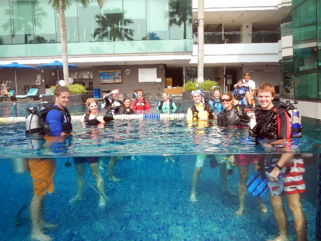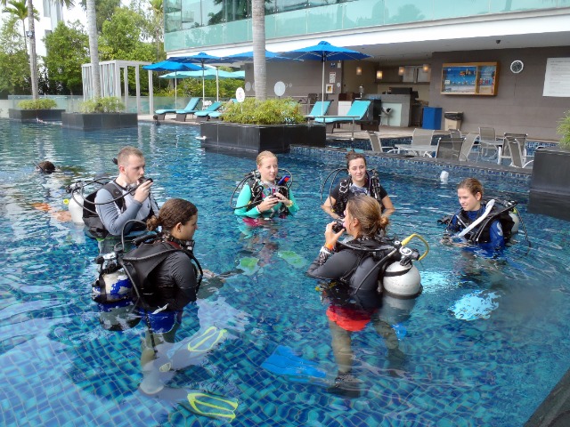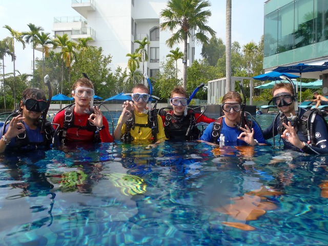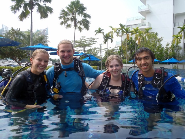 Today, the crew of the Argo woke up and headed straight to the pool for a sunrise swim test. Thankfully, everyone passed with flying colors. After a delicious breakfast, the crew split up into two teams: those who were doing their open water and divemaster training and those who were already dive-certified. The divers enjoyed the clean, clear water of the posh One15 Marina pool, an infinity pool with a glass wall making for amazing pictures. Everyone enjoyed their first breaths on a regulator and were excited to take their first breath underwater. Everyone said their first dive was a great experience, and little do they know it only goes down from here (pun intended) as they will soon be heading a little deeper for their next dives in the salty ocean in the Gili Islands. The other group braved the Singapore subway system and visited the Asian Cultures Museum and Chinatown. The museum was a great insight into the history of Singapore and some of the other locations on the voyage. In Chinatown, some students were adventurous enough to try the local street food, including dumplings, fried rice, and steamed rolls. The crew also visited the Chinatown wet market, where all the fresh meats, fish, and produce were on display for purchase. It was a bittersweet feeling seeing all the marine life for sale. It is interesting to see some species we have never seen before. Afterward, the crew all returned to Argo for another filling meal of pork chops, couscous, and stir-fried veggies. Everyone headed back to the Singapore subway system to visit the Singapore Zoo for their Night Safari Program. A description of the zoo and pictures will be in tomorrow’s blog.