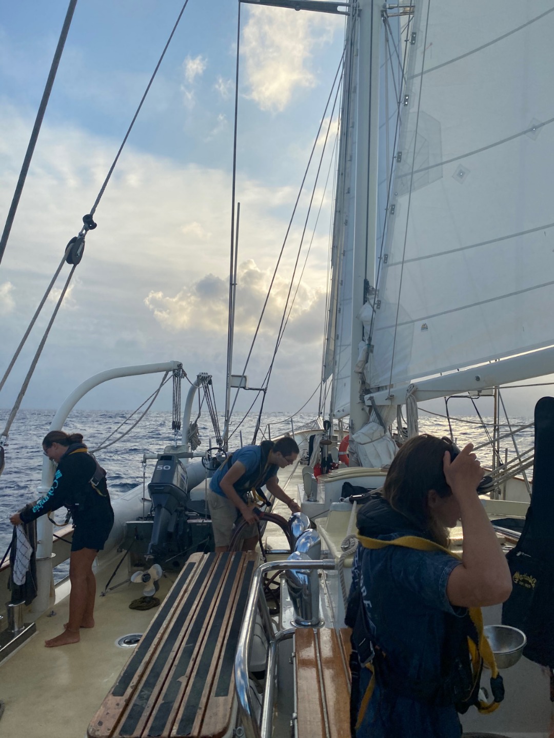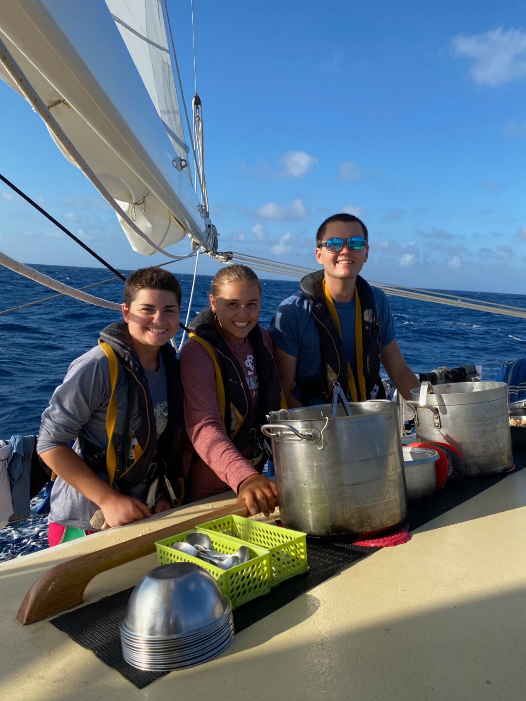 I am happy to report that it feels like we’re all embracing the rhythm of passage – 4ams and all. I started today off with the sunrise watch, welcomed, of course, by the very best watch team (#3 baby!). Here on Argo, what we lack in any form of land or hard surface that isn’t constantly rolling, we make up for in wicked sunsets, thunderhead clouds, and schools of flying fish. A worthwhile trade, if you ask me. Days are beginning to blend into one another as we continue the never-ending watch-sleep-eat-watch-repeat cycle, so we’re appreciating the small things even more lately. Instant coffee and sunny mornings, for example, are my new best friends.