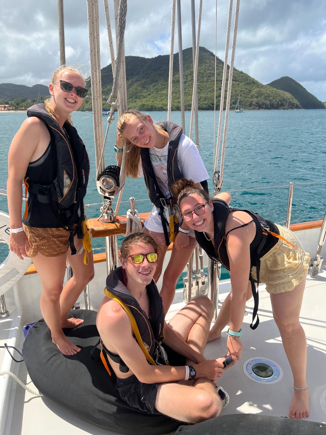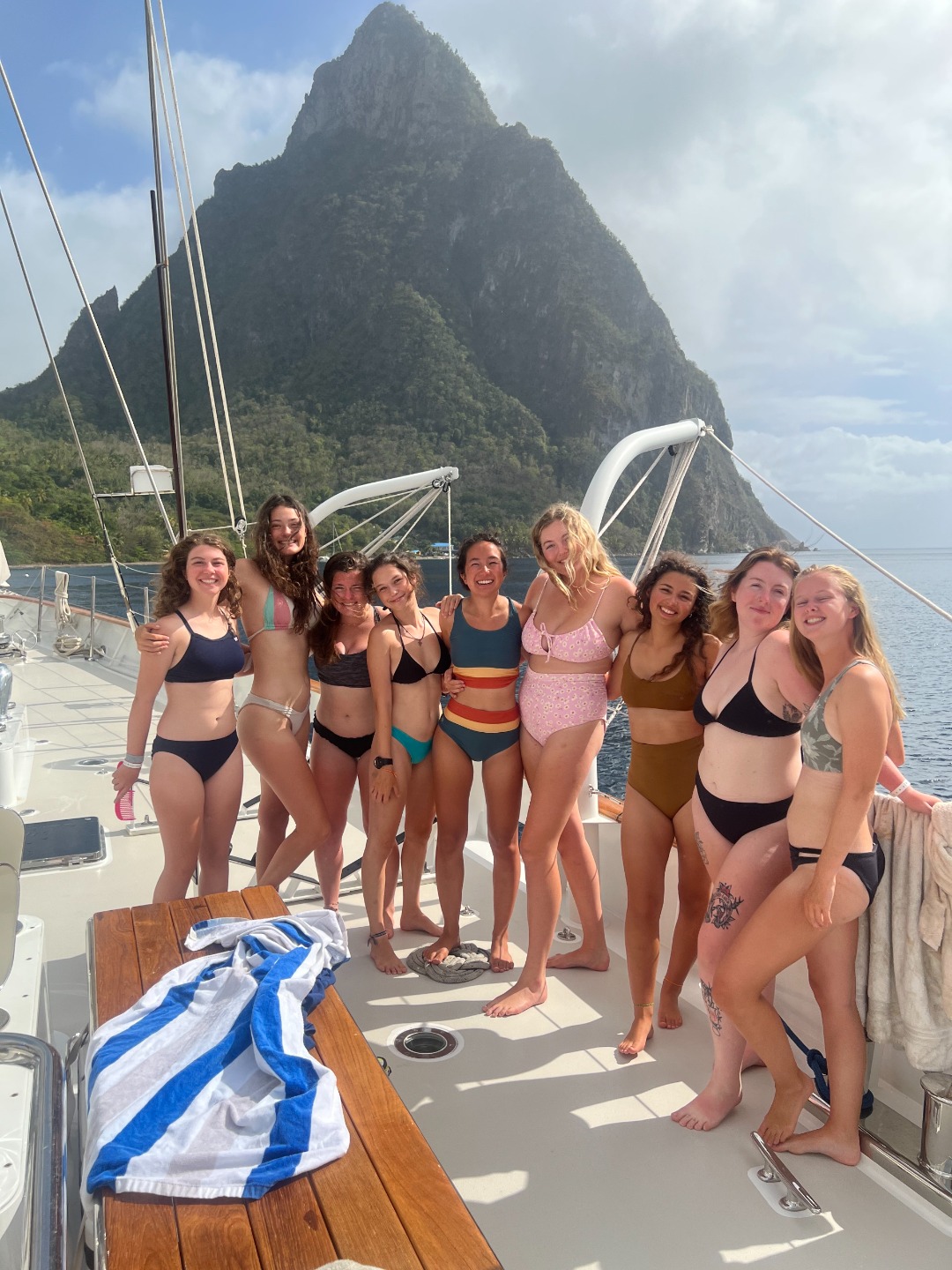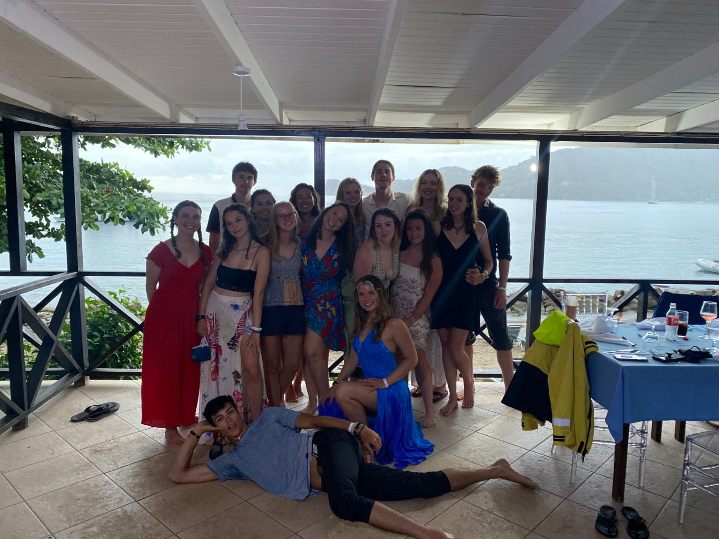 Our morning started out with a bang as all our covid tests came back negative, and we were cleared to enter the beautiful St. Lucia (or St. “Loo-see-ah,” as Audrey calls it). We quickly got off the dock at Rodney Bay and began our breathtaking motor down the coast. Being completely transparent with you, I’m making assumptions here because we spent the trip down below taking our very first Oceanography quiz, which was just as fun! Woohoo! But the glimpses I caught of the St. Lucia coastline from the portholes as I struggled to recall the difference between convergent and divergent tectonic plates was certainly gorgeous. We finished up a Marine Biology lecture as we anchored next to the famous Pitons (or the “Peanuts,” as Ryan calls them). A much-needed ocean shower after a sweaty day of using our brains led us right into our first sign-out dinner night! Our Uber dinghies brought us to shore to the most (bare with me, there are only so many words that can describe the most beautiful places in the world) stunning restaurant right on the water. As much as I love our intimate meals in the boat cockpit, it was so fun to sit down at a big table and to enjoy a meal with everyone in a different setting. And now… let the birthday-eve celebrations begin!!!! I’m sure you’ll hear all about it tomorrow, but our very own Ryan, Ry-Ry, certified big dawg, is turning 22 tomorrow. For such a special occasion, we had to celebrate in classic Vela fashion: a dance party. We quickly took over the restaurant aux and went wild. Hopefully, the other restaurant-goers enjoyed Mama Mia, Cher, and our favorite Brazilian songs and choreography (taught to us by Sofia) as much as we did. Naturally, I’ve had many dance-offs in my life (classic Sharp), but I have to say that absolutely tearing up the makeshift dance floor with my college professors is a first for me. But definitely not a last. Shoutout Cahrollin’s wicked smooth moves and Dill with the iconic hair whips.