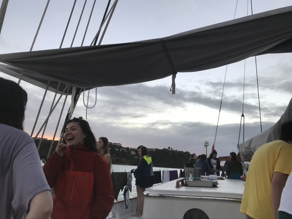 We started off the day with some french toast for breakfast made by one of the supervisors, Leoni — and students, Hannah and Katie. Following breakfast, we had our first day of class; three classes were done today, back-to-back-to-back. All classes were great; like Gregg said at the end of the day — when talking about highlights of the day — it was interesting learning about the history of marine science. It’s fascinating to see how fields of study progress from researchers working off of the hypotheses of others, influenced by disagreements. Tom, our captain, demolished Calum, our supervisor today in chess, who is still crying right now. Lunch was also fantastic today; we had chicken Caesar salad wraps. We also realized that there are goats chilling on the side of rocks near Vela. Meagan pointed out the goats last night, but nobody believed her. It’s pretty funny seeing the goats just chilling there.