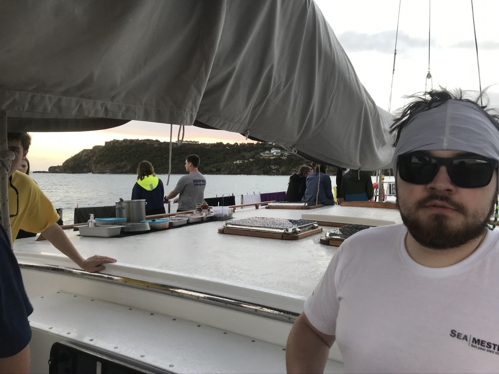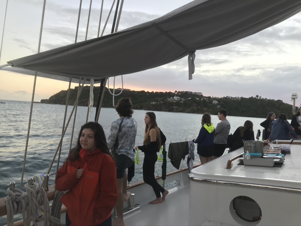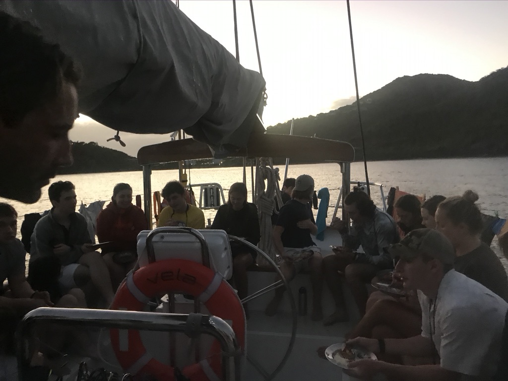 Also, we had our first day of scuba diving. Though I heard from Jordan today that the water was pretty murky, an eventful moment happened when a starfish stuck to Anthony’s knee. While they were out having a good time, the non-scuba-certified students had to do an extremely long course of videos and quizzes to start getting certified. Will pointed out a whole lot of fish today and a green sea turtle. As annoyed as Andrejs and I were, I’d say we were all happy to get through it, and we all learned a lot. Everyone got a bit more talkative today, even though we were pretty talkative from seeing each other at the airport. We had a great time after dinner, where we answered the question on what our favorite marine animal was and why along with our highlights of the day. Nobody is sticking to one group when eating or when chilling on the deck. It’s nice to see us all comfortable with each other and having a good time. We had enchiladas for dinner that were perfect.