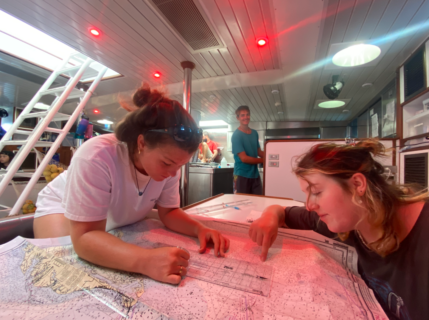 everyone gathered in the salon for Nav Master class!!! Charts were unrolled, parallel walking