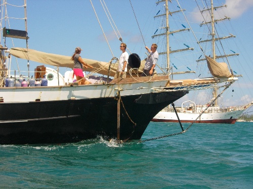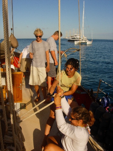 The day began with some quick and easy cereal before letting go of the mangroves that our stern was tied to and raising the anchor. Upon departure, Chantale served the second part of breakfast, banana bread. It was eagerly scarfed down by the crew, but mostly Stu. We motored from Marigot Bay to “rocking” Rodney Bay, where we refueled and sent Maia and Lisette to provision. After pulling away from the fuel dock, Ocean Star proceeded to the bay outside of the lagoon. After setting and hauling back three times, we finally got a good bite with the anchor. By this time, the provisioners had returned with fresh meats and baguettes for lunch. It is the first time the crew has seen provolone cheese this semester. After a quick boat appreciation session, it was shore time. Everyone was quite disappointed that the internet cafes were closed but were satisfied with ice cream cones instead. A 4:30 MTE class was held under the sun, and we learned about dead reckoning and estimated position. For dinner, we had falafels and potatoes, which tasted great in wrap form. Finalizing the day with a French lesson in communications class and preparation for our passage to France made this glorious day a success and a joy.
