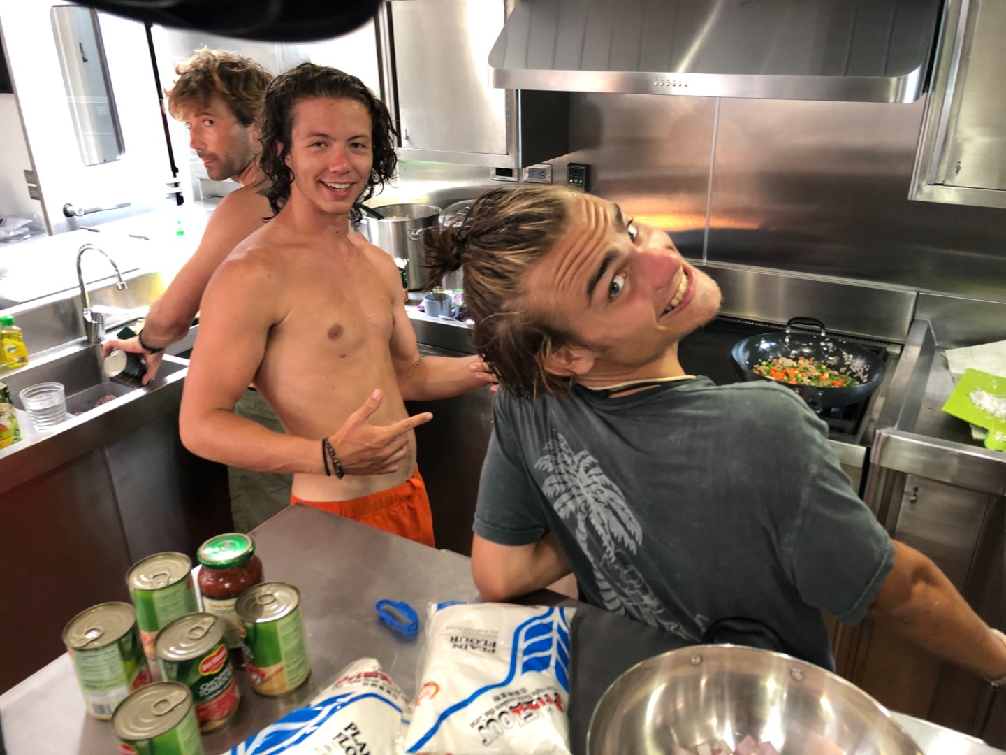 2. Zak, Robbie, and Tom in the galley cooking fried rice