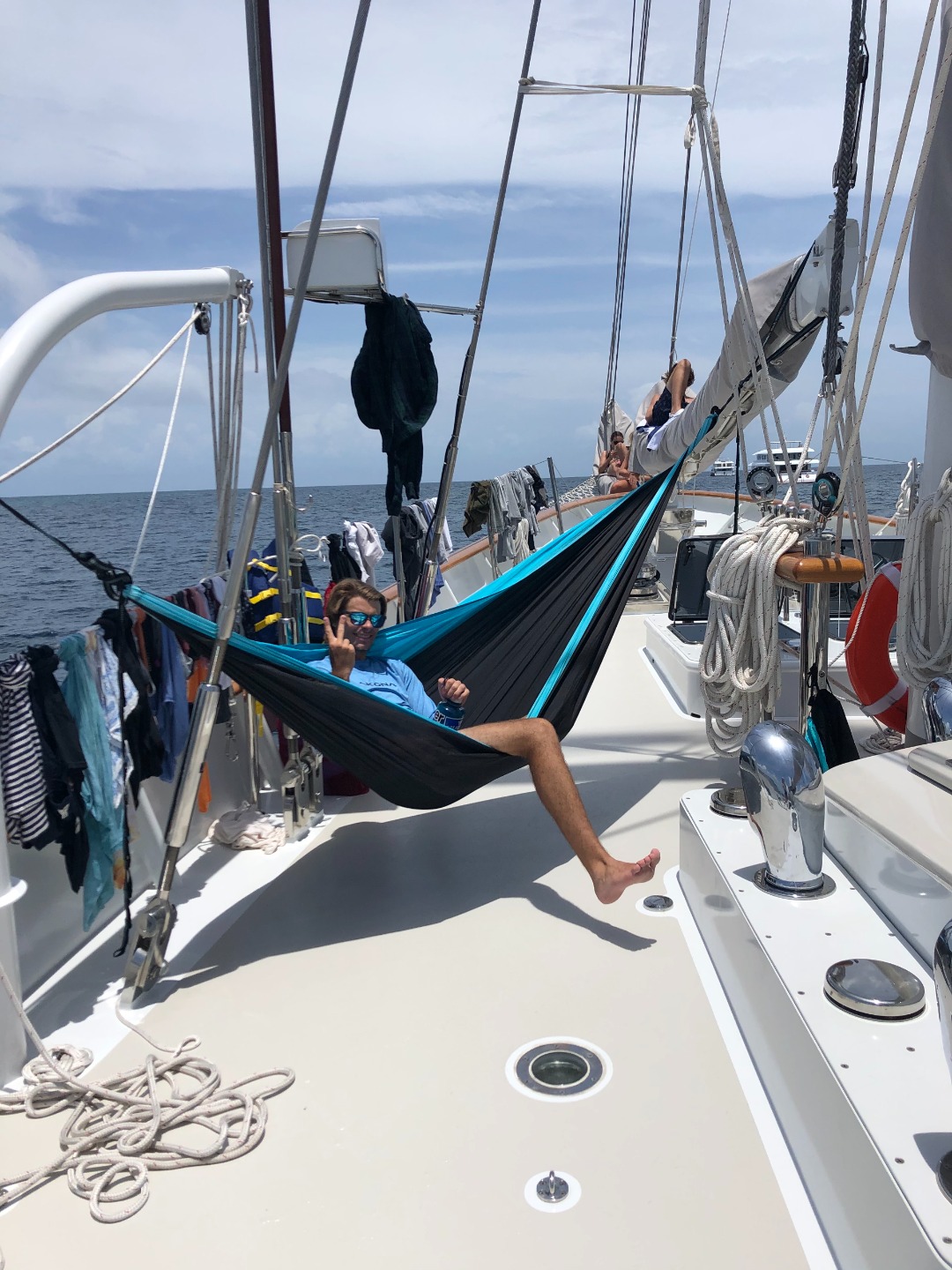 We started the day with a relaxed morning, taking advantage of the paddleboards and surfboards we still had. Emily and Noah, both being experienced surfers, got the opportunity to surf some insane swell. Wish I could’ve seen them myself, but it sounds like they had a blast. The rest of us hung out around the boat; For those who didn’t skurf yesterday, they got some time today, and the progress was so entertaining to watch. Mo and Dylan had a lot of hammock time, Tom taught a lot of people how to splice, and Trey got some guitar lessons from Noah (excited for more late-night jam sessions from our talented guitarists, Noah and Robbie; feels like a front-row seat to a live show). Cate and I went for a paddle, and it was so surreal to float behind Vela and take it all in. She really is our own personal island, equipped for sleeping, cooking, class time, and all the fun.