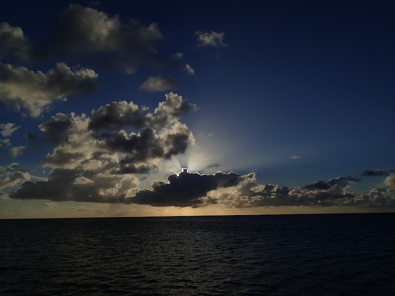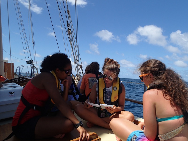 Following lunch, Kris challenged the shipmates to estimate our time of arrival on Barbuda using only a piece of bread, a watch, a calculator, and a few facts (like one nautical mile = 6076 feet). Everyone laughed as they threw the bread off the bow and timed how long it took to cross the stern. Though some were a little rusty in their conversions, all the groups came up with an arrival time estimate that turned out to be correct within an hour. Watch Team Three take care of Ocean Star for the majority of the passage and are the first to spot the flat island of Barbuda off in the distance. Bow-watcher Dave also spotted a sea turtle from his position at the front of the boat. Our speed was over 7 knots for much of the sail, and we were able to drop sails and anchor just in time for dinner. Pink skies and puffy clouds surrounded us as we ate and cleaned up. Now, shipmates are in the salon as Tor teaches them Secondary Care, the final portion of their Emergency First Responder certification. Tomorrow’s agenda is fun and games, literally, with a little bit of science mixed in (the best kind of fun). Until then, good night from Ocean Star!