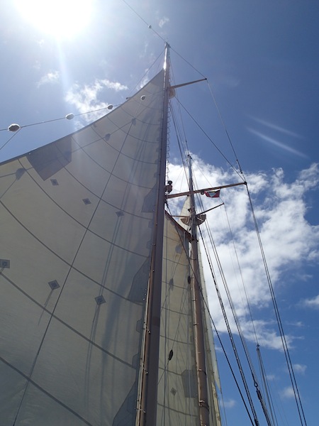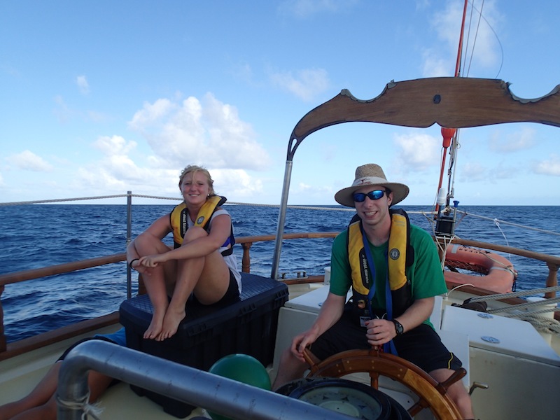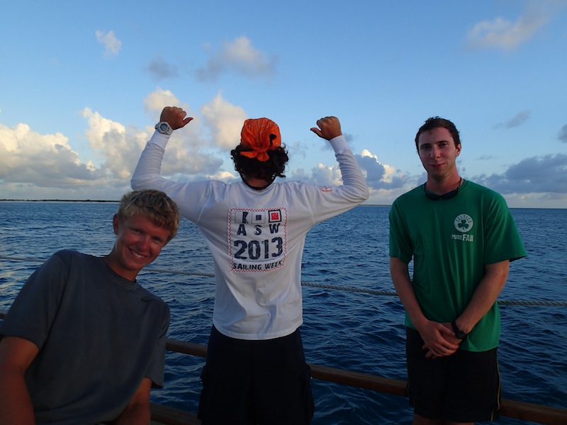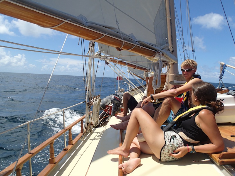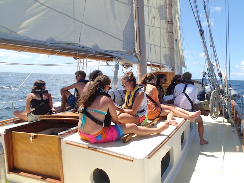 As we sleepily climbed on deck this morning, we found that the chefs had prepared our captain’s favorite breakfast: beans on cheese on toast. Our British contingent was psyched for the tastes of home. While we enjoyed breakfast, we reminisced about the awesome evening we had last night. For many of us, our beach cookout under palm trees at sunset ended with a twilight swim. The lights of Falmouth Harbour were reflected in the water around us, but brighter still were the blazing stars. Aaron and I gave an impromptu lesson on finding the Big Dipper and the North Star (not the brightest star in the sky!) as we all floated in the warm sea. Meteors streaked above, but cooler still was the light show around us; bioluminescent plankton lit up with every movement of our hands and feet. That hour we spent in the water will definitely be one of the top memories of the trip. But that was last night.