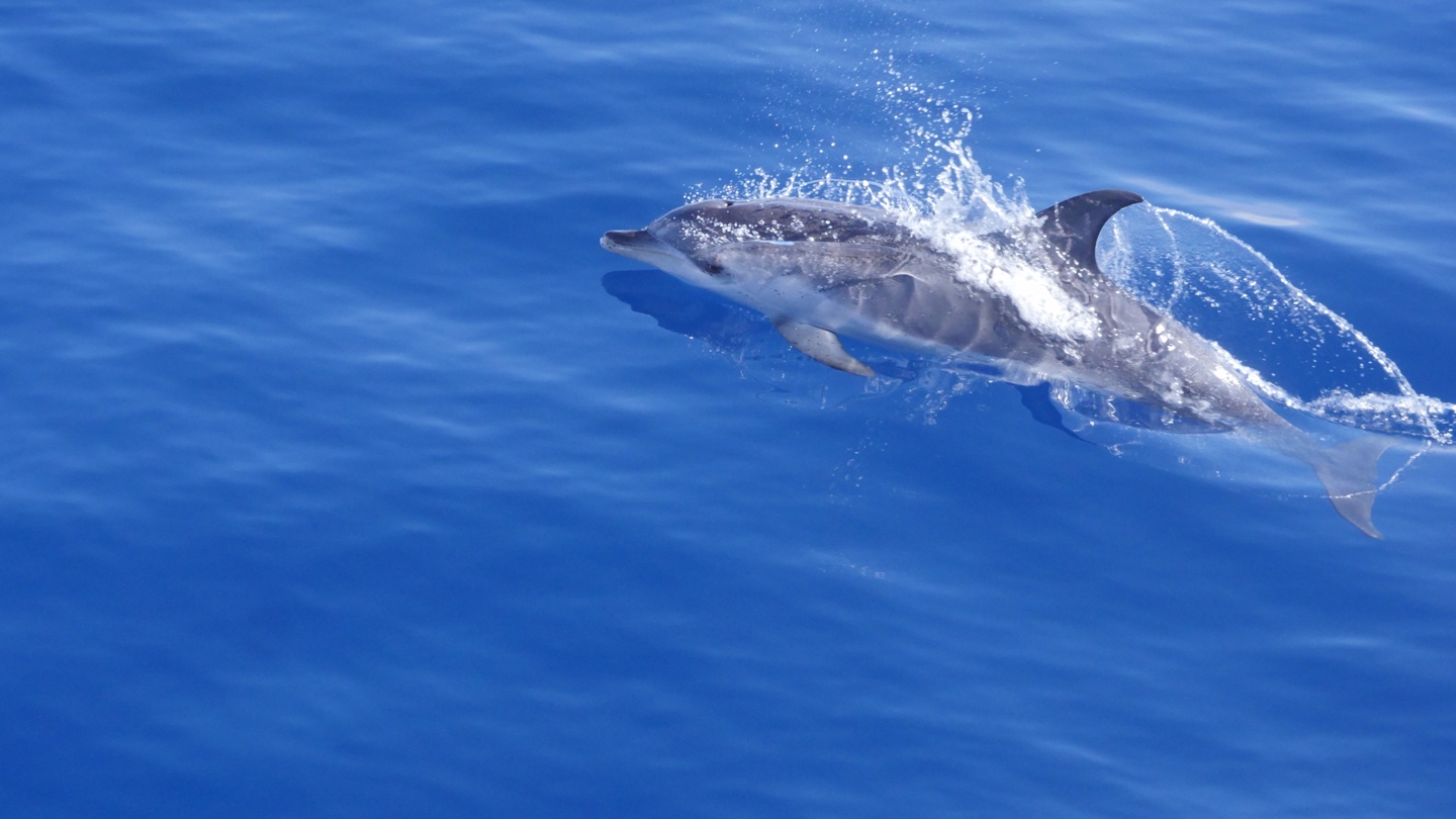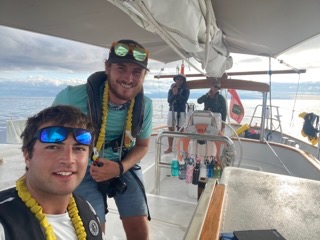 Anticipation was high as we woke up for our last morning in the Azores. We took on a small amount of reserve fuel as the last bits of passage prep were checked off. When we were ready, the engine was started, and we began our undocking sequence. Lots of people from the marina came out to watch; it’s not every day you get to see a vessel as beautiful as Vela actually leaving the dock! Once out of the marina, Runyon went a little kookoo and jumped overboard! Don’t worry; it was all part of a drill, and Runyon was an eager volunteer. He even managed to execute a perfect lemon drop for the drill. After a successful rescue swimmer recovery, we were finally underway and bound for Gibraltar. The forecast does not seem to be the greatest for this passage, so unfortunately, we’ll have to do more motoring than we would like. The Azores were so beautiful, and I think we all would have loved to spend the whole summer there exploring all the islands, however Gibraltar is calling us and we are excited for our next adventure! The dolphins seemed to appear by the hundreds as they escorted out Sao Jorge channel, even a few whales breached off our bow to say goodbye. That’s all for today, until next time!