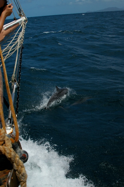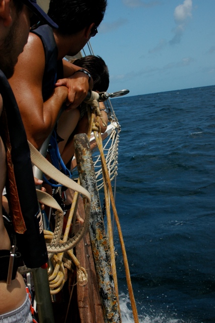 We bid a fond farewell to Dominica this morning after an epic few days playing in the ocean, rivers, waterfalls, and hot springs. Today marked a milestone for Ocean Star and her crew. It was the first day where the shipmates hoisted and trimmed sails entirely on their own without any help from the staff- and they did a stellar job! It’s one of the best sailing days we have yet, and we even broke out the flying jib- a new sail for us- to commemorate the day! We sailed toward the Saints at speeds up to 11 knots (but mostly around 7 or 8), making good time and anchoring at around 1:30 this afternoon. The journey itself was eventful, including some bow-riding dolphins maneuvering to avoid sneaky fish traps, and we were even graced by a visit from a sea turtle. After a much-needed swim call to combat the hot Caribbean sun, we showered O-Star with our gratitude for some quality boat appreciation time. We scrubbed the decks and the galley, polished brass, and generally de-funkified the boat. We dined under the orange glow of the setting sun and spent the evening in MTE class learning about navigation. It’s been another epic day aboard the Ocean Star!