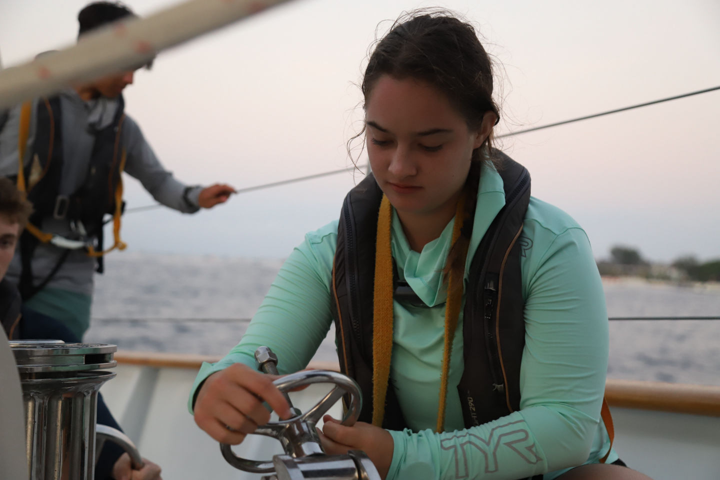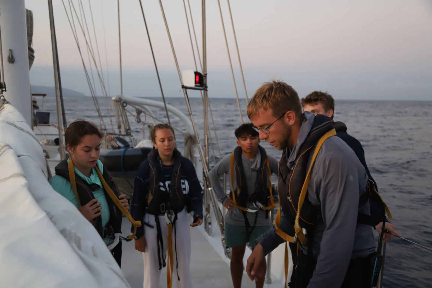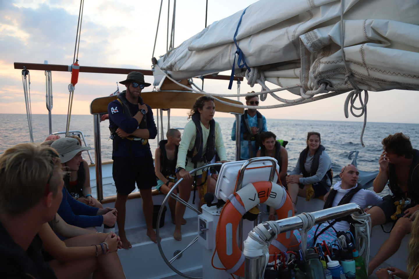 This morning started with sunrise anchor watch at 4:30, with Siena docked off the coast on Lombok. We watched the sun rise over the mountains while talking about our pets (miss you, Beau!). Our only note on the anchor watch sheet was how we were both extremely startled by the fish that jumped off the stern. After being relieved, we had an amazing breakfast of baked oatmeal and fresh pineapple from Smash. We then talked about prepping and creating our own meals as our first student head chef starts in two days. Soon after, we started our journey to Sumbawa to arrive by six tomorrow morning. Our first-day watch began when students on watch team 1 were able to take the helm (some better than others) as we’re underway to Sumbawa for a quick 2-hour stop tomorrow.
