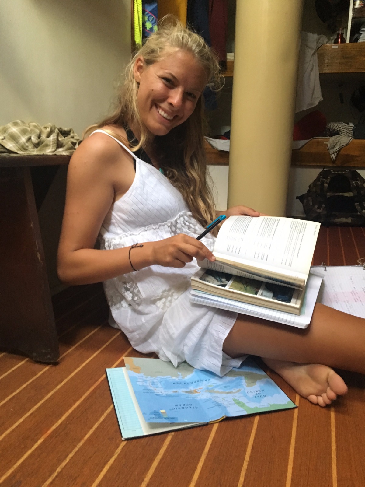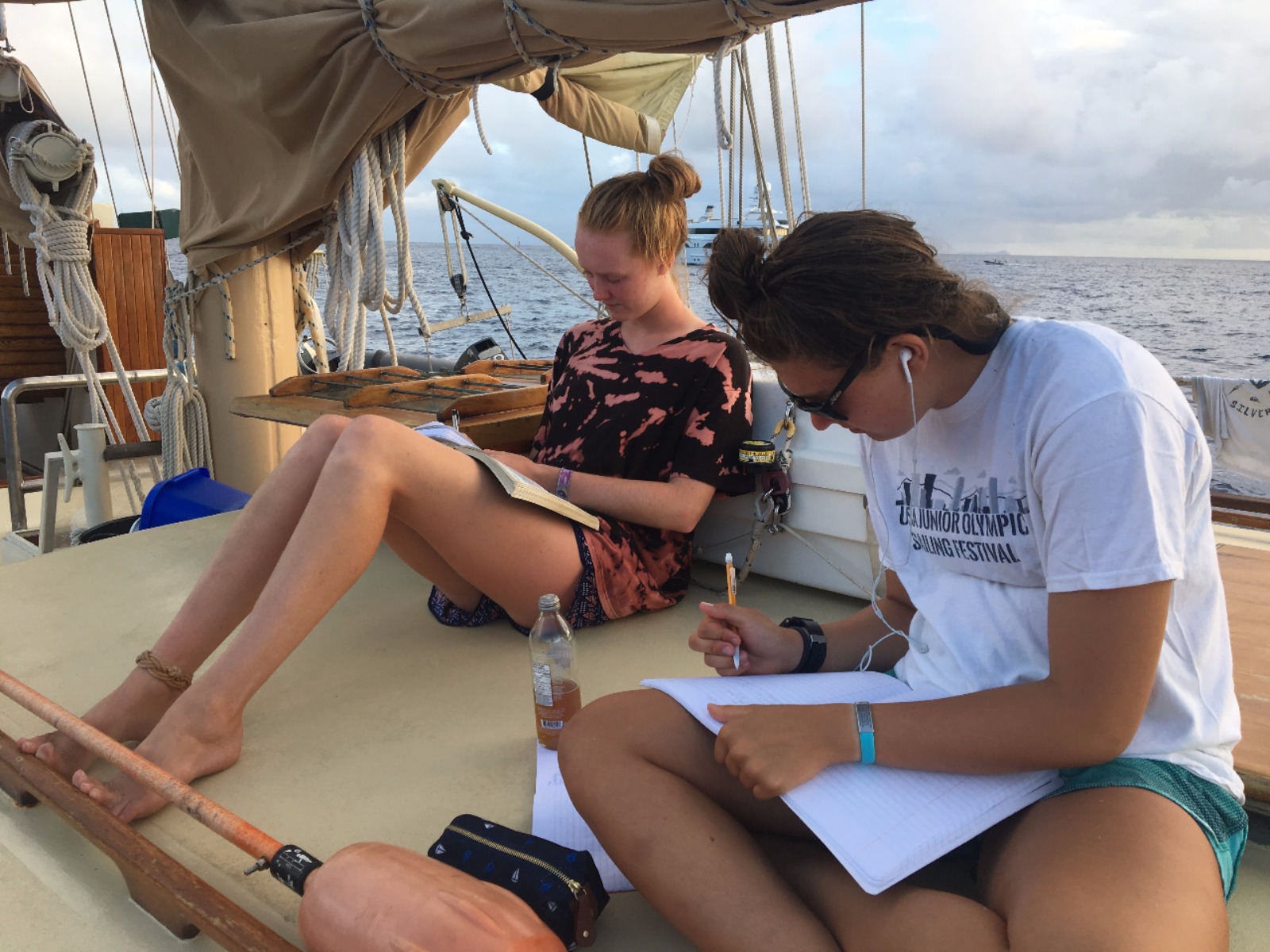 Today began with a typical 7 am wake-up for the Ocean Star crew. However, the breakfast provided was anything but typical. Green and pink waffles were served for breakfast by Will and Hunter. Their reasoning, you ask? While making the batter the evening before, in their late-night daze, it seemed a good idea to have green waffles for the gluten-free students and pink for everyone else. They were supposed to be red and blue, but our limited food coloring supply only went so far. Afterward, with full stomachs, the crew had two classes. Oceanography came first, where we learned about climate change, emissions of greenhouse gases, and the effects they can have on the ocean. Afterward, we revisited overfishing and aquaculture when we watched a short informational video on a new design for fish farming in the open ocean. Next, we had a seamanship class. We were called on deck abruptly to respond to an “emergency scenario” where we were to pretend we were lost. Using only a magnetic compass, a chart, a plotter, and a pencil, we were told to perform a triangulation to determine our location. It was difficult, but after a few tries, we got it down. This practice was not only good practice for our upcoming Nav-master exam; soon, we will be in charge of planning and conducting our own passages. It seems daunting now, but with practice, I really think this crew will rise to the challenge. After class, the crew headed to shore for free time and lunch at the restaurant of their choosing. However, after lunch, we were met with a surprise – Saint Bart’s literally shuts down on Sundays. NOTHING was open. That didn’t stop the crew, though; we made our own fun. We walked around town, and some of us split off to see the oldest tree on the island, while others went to a beach made of shells known as “Shell Beach.” Still, others, being sunburned from surfing and tired from the heat, decided to stop for smoothies and coffee in the shade. After returning to the boat, we had a less colorful but still delicious meal: an Italian pasta bake. Now, as the crew cleans up, we prepare to watch Blackfish. It’s a documentary about marine mammals in captivity. Coupled with this, we will read counter-argument articles to prepare for a debate on mammal captivity on Day 66.