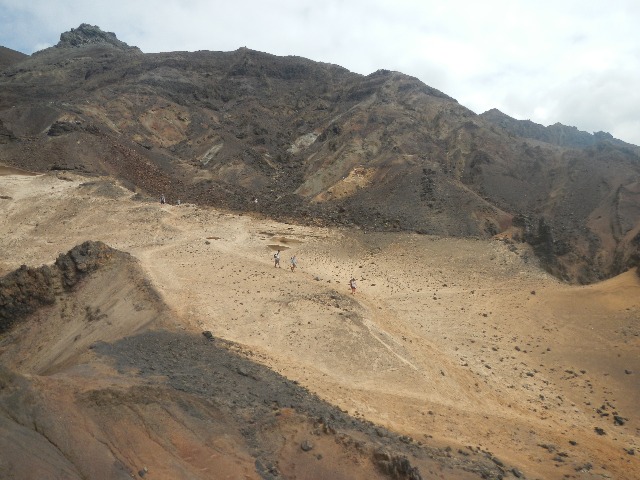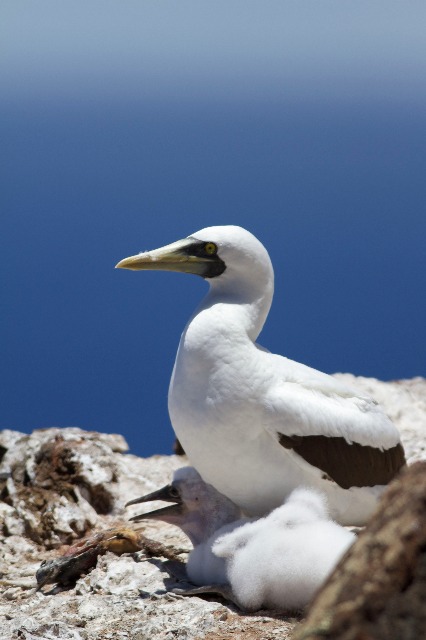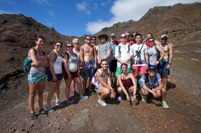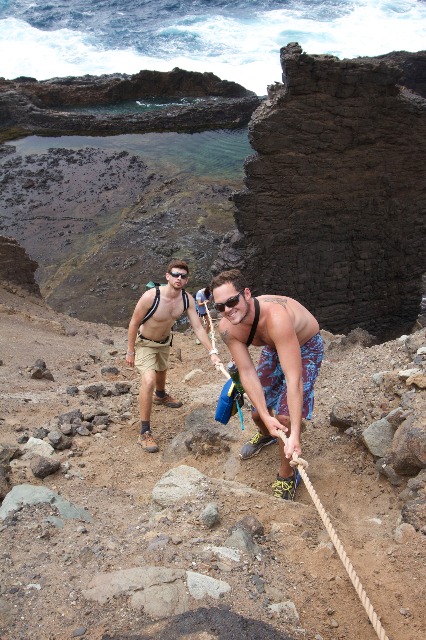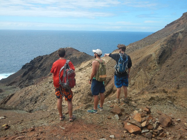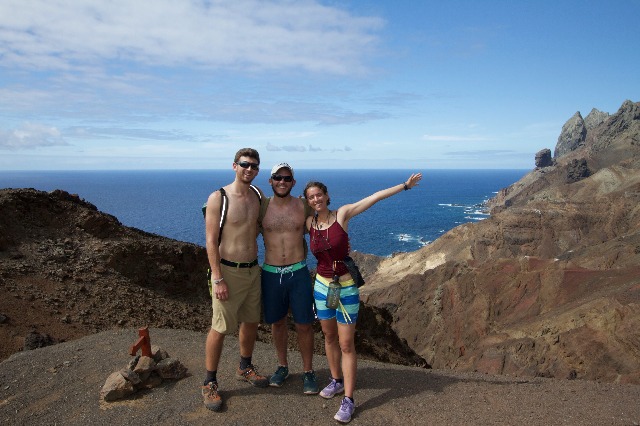 Around 9:00 this morning, we boarded a bus to take a hike around St. Helena. The bus took us up into the mountains, through a forest and fields peppered with cows, and down a windy road into Sandy Bay. Our two guides, Aaron and Julie, then took us on a one-and-a-half-hour hike that ended in emerald green tide pools on a black, gravelly shore. Along the way, we passed an arrangement of rocks that told us “Lot’s Wife’s Pond” was to the right and “Fizzle’s Pie” (at least that’s what I thought the rocks said) was to the left. My understanding is that “Lot’s Wife’s Pond” was underneath a rock on the cliffs. We were hiking around, which was also called “Lot.” Anyway, it was just passed this point that we saw nesting Masked Boobies on top of one of the cliffs. It was a pretty amazing sight to see, considering we were also able to see the fluffy chicks underneath them. After hiking along a reddish rocky path that often dropped off into breathtaking sites, we all had to use a knotted three-strand rope in order to get down to the tide pools.