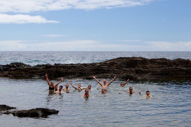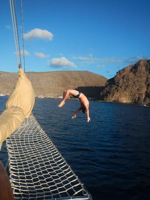 Since the weather was just sunny enough to dehydrate us, stopping at the tide pools for both a swim and lunch was close to heavenly. We cooled off and saw some amazing marine life (namely red crabs that looked a lot like Sally Lightfoot crabs, snails, limpets, damselfish, triggerfish, and a voracious octopus eating a crab) and reviewed a little bit of Oceanography and Marine Biology. We learned that St. Helena is a product of two volcanic eruptions and that most of the original vegetation on the island was eaten by hogs and goats brought by the Europeans in the 16th Century. The island’s vegetation is dominated by introduced species, yet scientists are still trying to quantify/classify the species endemic to St. Helena. By the time we hiked back to the bus and drove back to town, all of us were pretty exhausted. Some of the shipmates stayed in town for the afternoon to buy snacks for our next passage, while others came back to Argo. One of the best surprises of the day was the sighting of a Devil Ray off the side of Argo. Some might call it a “majestic flap-flap,” others might call it “scary”…I think it was pretty amazing.