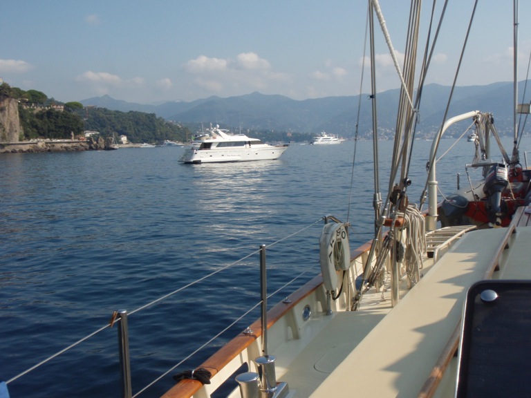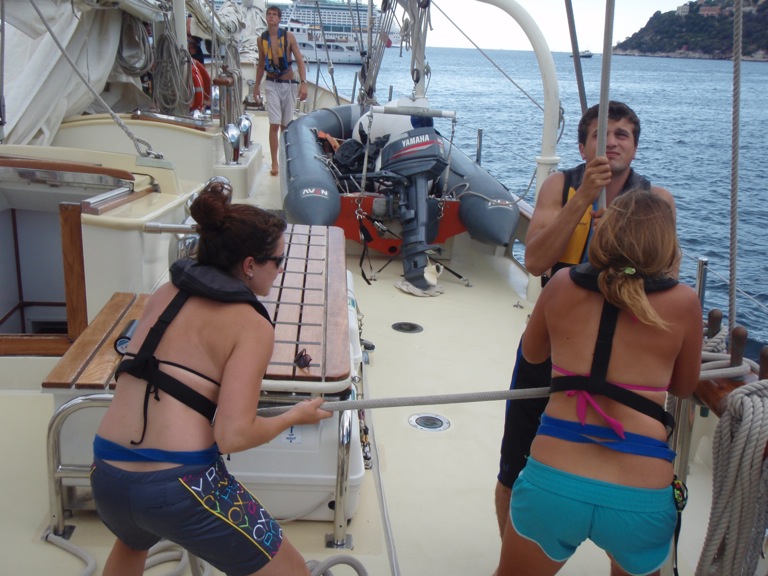 After an exciting night of fireworks watching in Ville Franche, the staff and crew of Argo awoke to a cool morning and ominous clouds. While eating delicious breakfast burritos on deck, the day took an unpleasant turn as the sky opened and it began to rain. Nevertheless, after an exciting sailing class with Captain Sean about sailing and the right of way, the clouds disappeared, and the sun emerged for the day. The crew quickly put their rain jackets away, boarded the dinghies, and were delivered to shore for morning shopping and exploring. The girls found the shopping in Ville Franche to be fantastic, while the guys munched on burgers and found an internet cafe. As quickly as we arrived on shore, we headed back to the Argo for a much-anticipated lunch of grilled cheese. Then we hoisted the sails, breaking an Argo record for speedy sail setting. Today was particularly exciting because we tore through 25 miles of ocean at 6.5 nautical knots, completely under sail power. Once in Cannes harbor, we practiced sailing maneuvers and enjoyed flaking (folding) the sail until we finally dropped anchor. The night ended quietly with movies and card games.