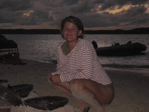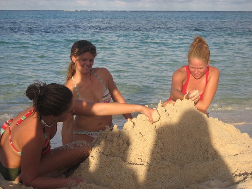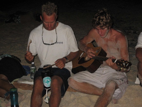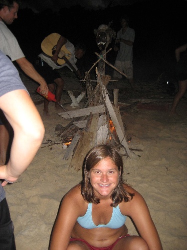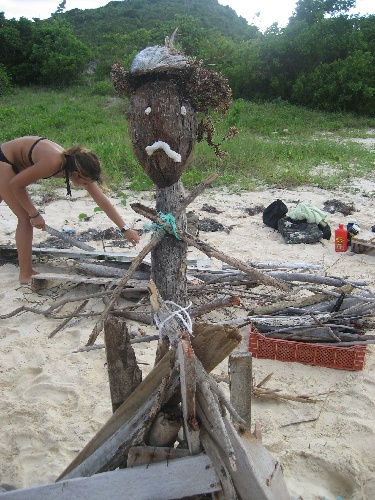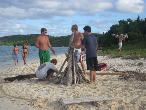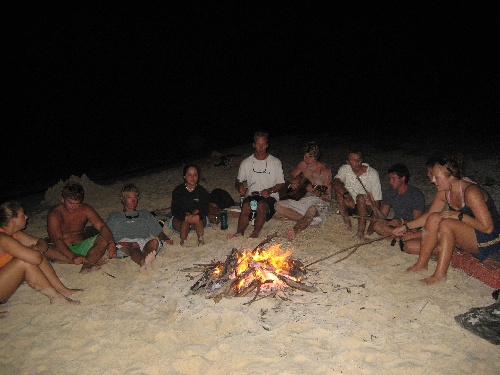 Today, we had a pretty chilled day – We had breakfast at around 7:00, and then the Rescue Dive Course took up the rest of the morning. After lunch, some people went with Beaker to do Elkhorn research, some went to hang out on a nearby beach, and some just hung back on the boat. As dinner time approached, dinghies shuttled people ashore. At 17:00, the feast began – Cheese Burgers and Hotdogs galore. After we gorged ourselves, we started the bonfire, and all had a guess as to how long it would take for the fire to reach Wilson (a stick man that was made for the occasion), who was perched on the top of the fire. Once the bonfire was burning steadily, we roasted marshmallows and made some Smores. They were fantastic. The night ended with Adam taking up the guitar and serenading us with ‘Puff, the magic dragon.’