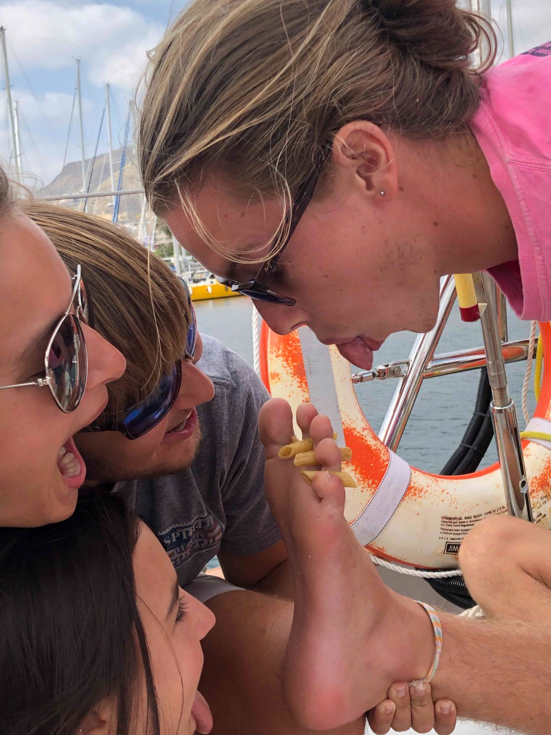 3. Dani, Helana, Bubba, and Pitty are eating pasta out of Emerson’s toes.