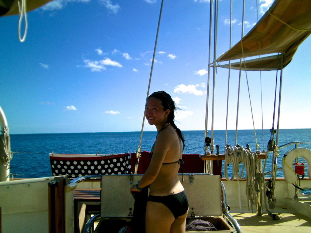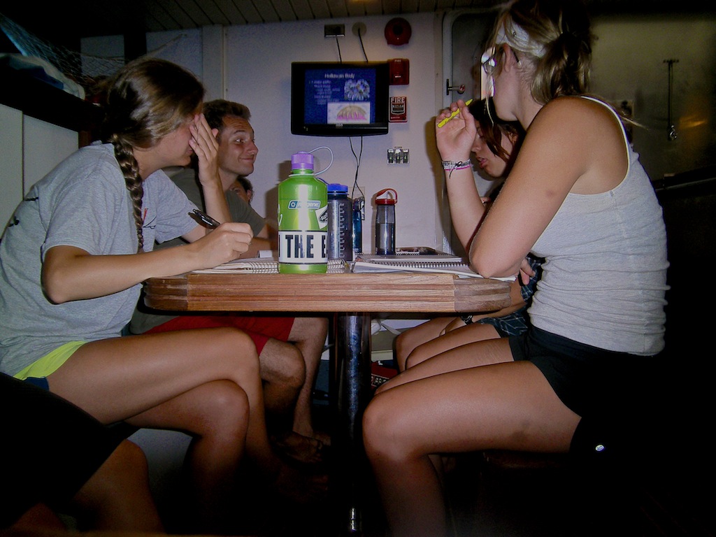 This morning, everyone got out of bed for some scrumptious French toast. After some positive words of encouragement during the morning meeting to increase productivity, our newest members prepared for their confined water dive sessions 1-3, where I’m told they swam with four rays. Were I to be taking Marine Biology with the rest, I might be able to share the specific name of these rays, but I can assure you it was a majestic sight to behold. Meanwhile, the rest of our crew took time to enjoy another of earth’s majesties, oxidation. That’s right; the rest of us used this downtime to clean and polish our Argo. Before long, it was lunchtime, and we enjoyed some delicious grilled cheese sandwiches and leftovers. To help aid the digestion process, the new members returned to their dive gear and finished confined water dives 4 and 5. Yes, the new crew fit in all their confined water sessions in one day. *reactions of awe* The rest of us continued to clean as well as prepare Argo to move to Haamene Bay in Tahaa. (Until we hear the correct pronunciation, we will pronounce it as HAA-ME-NAY). Underway, we were finally able to catch our breath for the day. Henry, Ryan, Ellie, Jim, Frankie, and Mina met together with Leah to plan out our schedule for a few weeks from now. I hear there is a hike planned for the future. If that is no more than a rumor, I’m happy so long as lunch is still scheduled. Finally, at Haamene, our chefs finished a wonderful chicken spaghetti Alfredo with buttered green beans. To give you an idea of how delicious it was, I went for seconds, but it was already finished offa tip of my hat to the culinary skills of Lindsey. For our squeeze question, I wanted to learn more about my fellow crew members by asking them to reveal a secret about themselves. I asked everyone to share an interesting fact about themselves that most people don’t know about them simply because it does not come up in casual conversation. Sadly, no one was a secret underwater basket-weaving enthusiast. In order to allow for the integrity of these secrets to be maintained, I will share only one: mine. I have very loose ligaments in my thumbs, so I can bend them back rather far. How thrilling! Everyone seemed to be an open book, but we all opened up a bit more to reveal more of ourselves to our new family for the next 62 days. Lastly, our day came to a close with Captain Sam leading the basic seamanship course, where we covered as many of the safety precautions as possible. Don’t worry. This was mostly a review for the academic purpose of this course, and all safety briefings were made at the beginning of this voyage. Then Alex Germaine and Frankie graciously volunteered to demonstrate how to put on the Gumby suits. To make things more interesting, we had them race each other to see who could suit up the fastest. It was hard not to be amused by two people who seemed to suddenly forget how to put on clothing, with the result ending in each of them looking like Ralph’s younger brother from A Christmas Story in all his snow gear. It has been a busy day that ended in many laughs, as most of these days have seemed to. On that note, I bid you all a pleasant farewell.