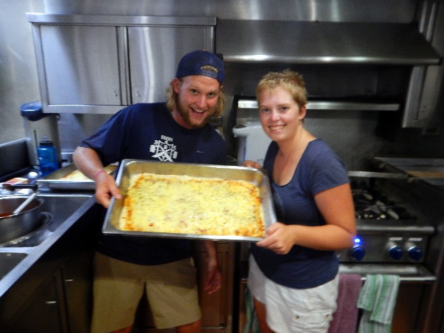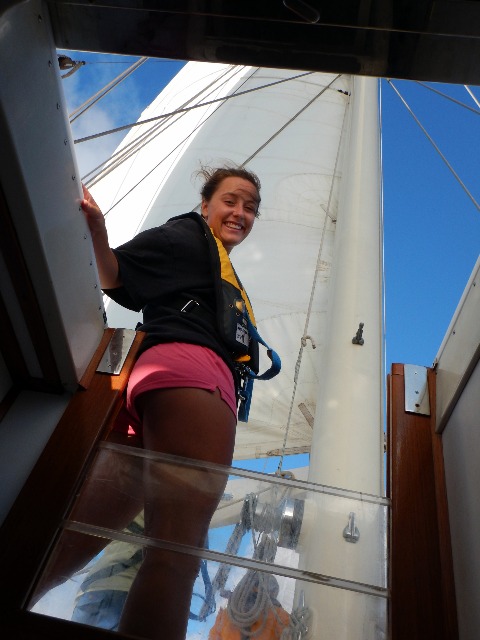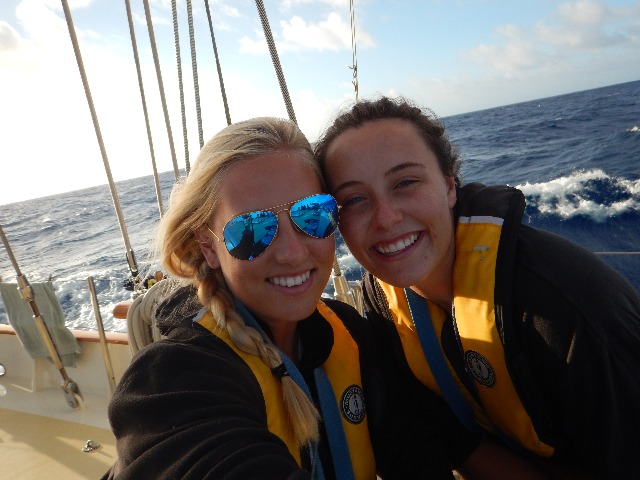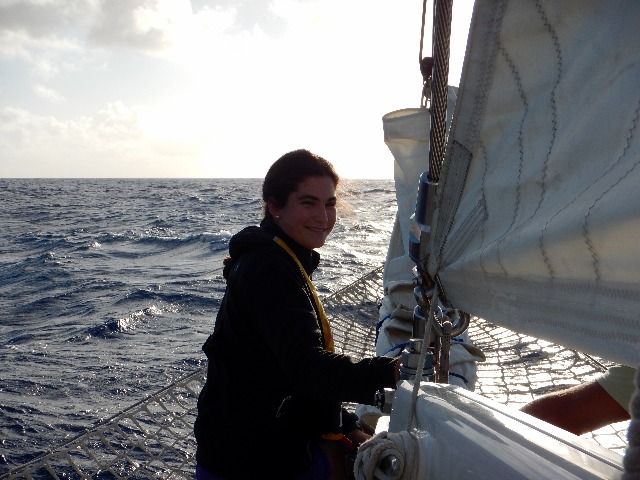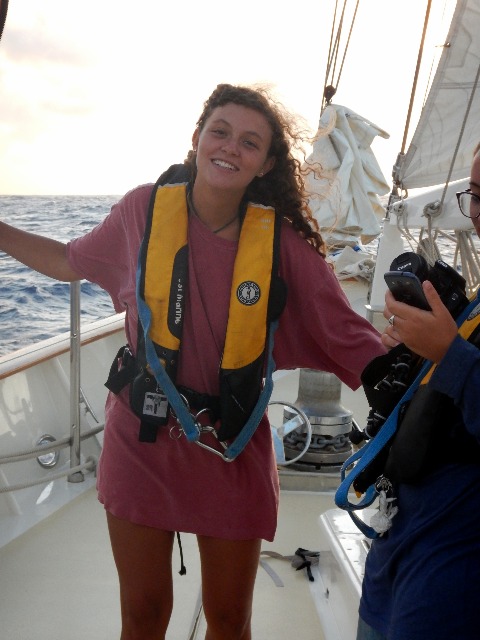Another day on the Indian Ocean is drawing to a close as we sail toward a beautiful sunset. After two days of intermittent rains, everyone aboard was happy to awaken to sunny skies and steady winds. We passed a huge milestone in our journey today as we crossed the halfway mark on our 2317 nautical mile journey between Cocos Keeling and Mauritius. As our crew has gained proficiency in sailing and settled into the simple routine of passage life, it has become easy to forget the magnitude of our undertaking. Looking at this evening’s position plot on the chart, smack dab in the middle of the ocean, is an exciting reminder of our endeavor and fills the boat with a sense of accomplishment. In academic life, students receive back their latest oceanography exams. They gave one-minute impromptu presentations on student leadership development, and those seeking their professional skipper’s license got serious about studying maritime law. Despite the other exciting events on board today, the highlight of everyone’s day was the food! Halle, John, and Griffin made two stellar meals: fried chicken and French fries for lunch and fantastic pizzas for dinner. Now we are settling in, with full stomachs, for another beautiful night of sailing under starry skies.