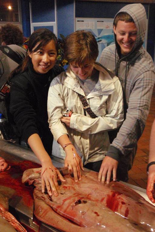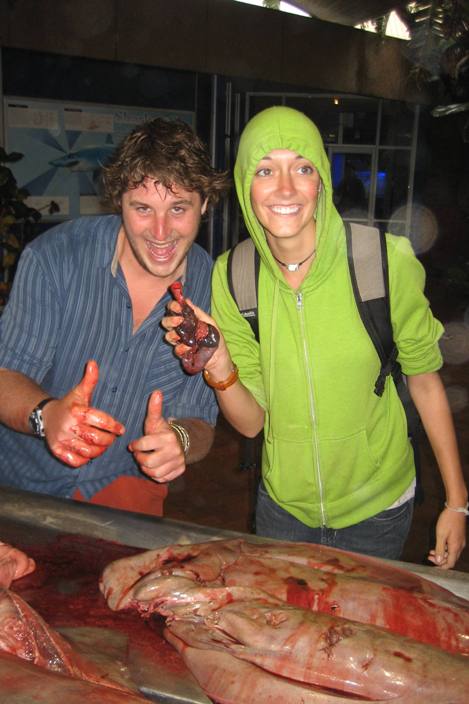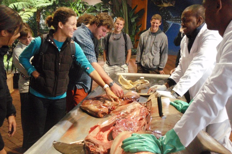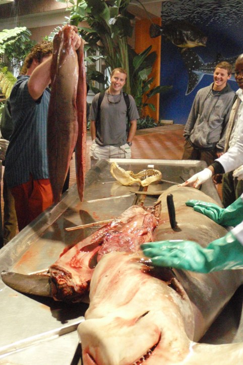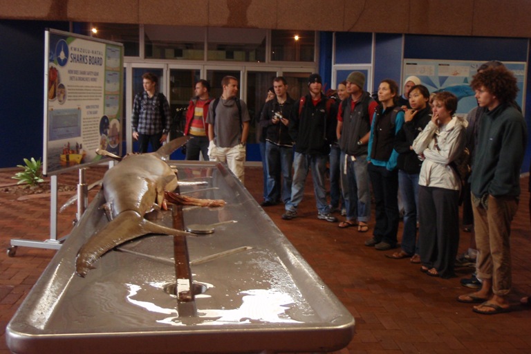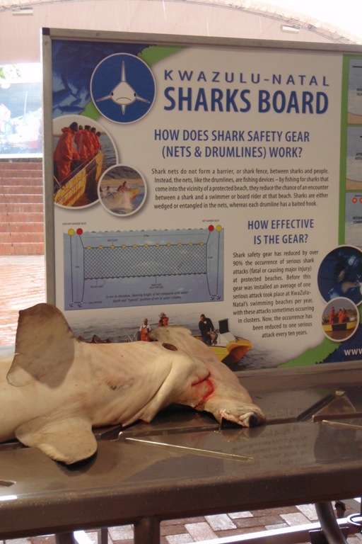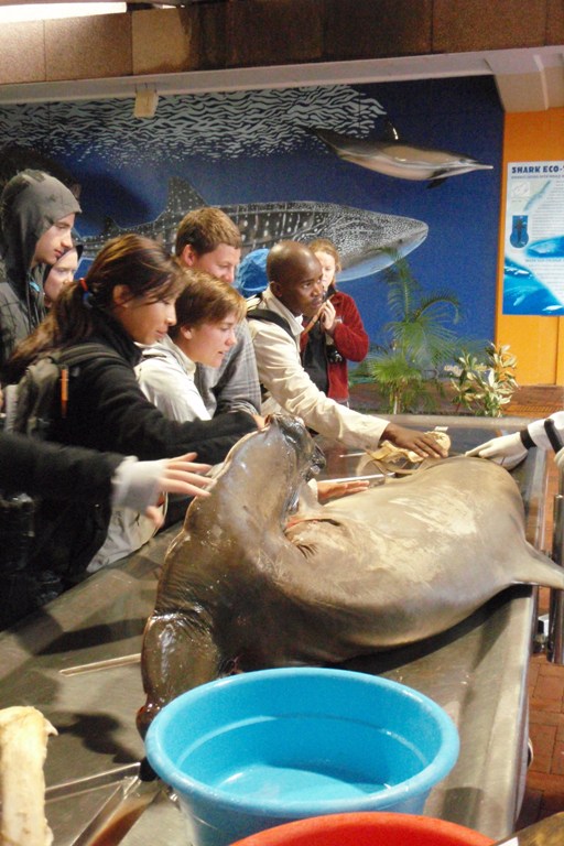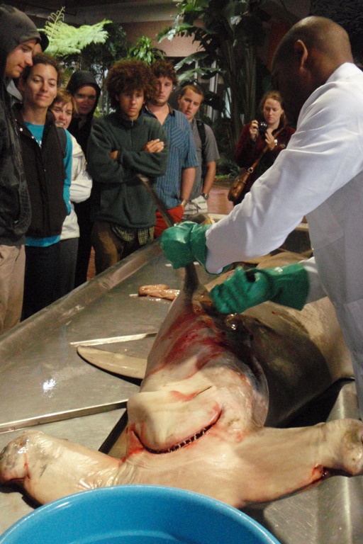 Today, like most days, began with a bit of an early start with a filling breakfast and a lightning-fast cleanup that was dotted with the usual wisecracks of the early morning, especially when there is a bit of rain. After breakfast, we all piled into a taxi which brought us to a shark information center, where we were taught all about the shark nets which blanket the beach region of South Africa. South Africa is known for its sharks, so there is a very large effort to learn more about the sharks as well as protect the shoreline from their possible attacks. The most interesting part of the day was the chance to watch a large hammerhead shark being dissected. We got to see, touch as well as smell the partially digested contents of the shark’s stomach, the large sheet-like intestines, as well as the very dense oily liver. After the very interesting shark dissection, we went to the local mall, which was very interesting to see the influence that American malls have on the rest of the world. All in all, it was a great day filled with some of the usual as well as some interesting activities.