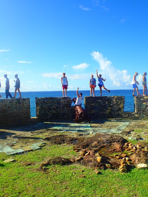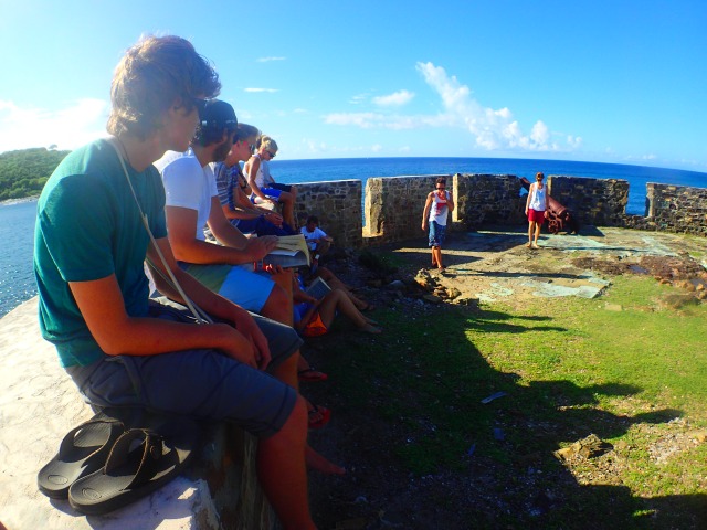 This morning started off rather differently than normal waking up. I half expected to walk up the companionway and look out onto the ocean from our anchoring, but then I recalled that we had docked the day before. It was truly the most liberating feeling being able to just hop off the boat straight onto the dock; some people decided to kick their morning off with a run, and others walked around Nelson’s Dockyard in English Harbour. After breakfast, we walked with Tor on the Middle Ground Trail to Fort Berkeley, with Student Leadership books in hand, and had class looking from the fort over the ocean. Returning to the boat shortly thereafter, Captain Ben let us know that due to the drought in Antigua, we needed to switch docks in order to get water and electricity. So, we quickly took the dock lines off, started the engine, and moved a few boat lengths away to another dock. For the rest of the morning, we had boat appreciation, where we scrubbed Ocean Star’s cap rails and gave her a soapy deck wash, and we completed the task with the enticement of shore time as soon as we finished. Racing to find a hammock store (closed, unfortunately), we explored Nelson’s Dockyard and Falmouth Harbour and, more importantly, had our first “real” shower of the trip (don’t worry, we’ve been taking showers in the ocean, plus a freshwater rinse; the locals, however, claimed with disgusted faces, (that doesn’t count). As there were many defeated faces in regards to the lack of hammock purchases returning to the boat, when the man who owns the hammock store personally showed up at Ocean Star with hammocks in tow, the mood quickly turned around. After a delicious pasta bolognese, we left Ocean Star to go to the Galley Cafe to watch An Inconvenient Truth, a documentary on climate change, for Oceanography class. Now, off to bed in our new hammocks! Goodnight & much love from Ocean Star!