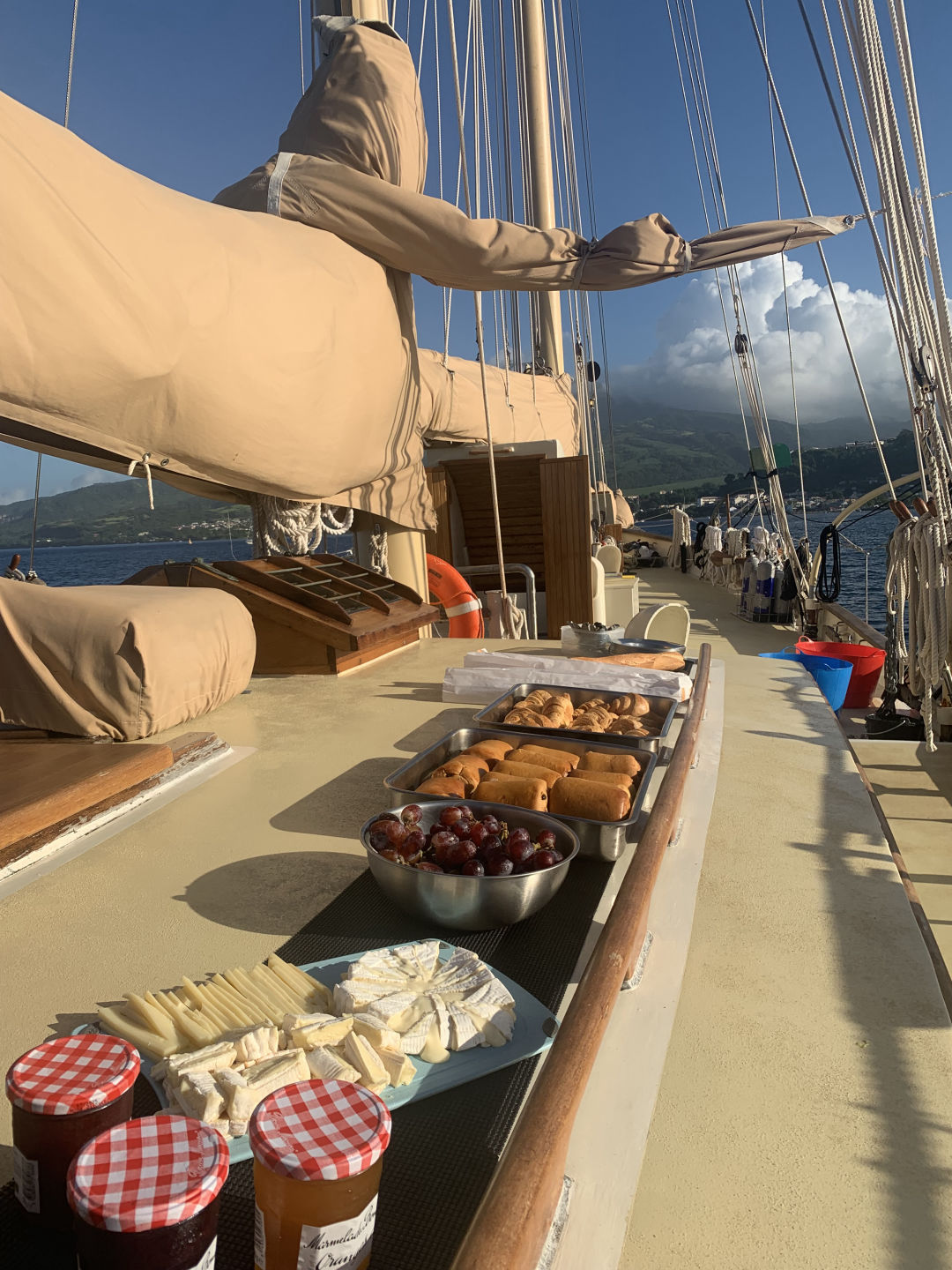 Today, we woke up and properly felt like we were in France. It’s still unclear whether Chefs Meg and Heather were working all night in the galley or the local French bakery was hired, but for breakfast, we had some fresh baguettes and pastries with accompanying cheeses and jams. As seen in the photos, this was accompanied by a beautiful sunrise. Being today’s skipper, it was my job to wake the whole boat up. It seemed the best way to do this was to play ‘I’m gonna be’ by The Proclaimers. This felt appropriate because it’s basically a song about waking up and going for a walk. Even though the hike we were all soon going on wasn’t 500 miles long, everyone was still super excited as we looked at the cloudy volcano’s peak from the boat.