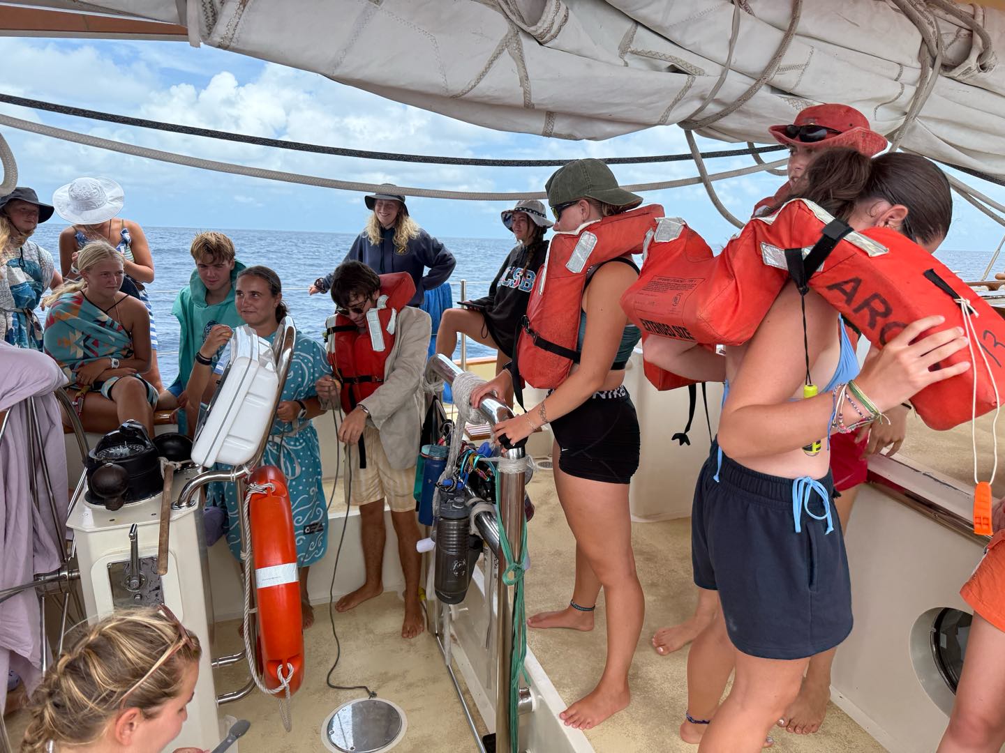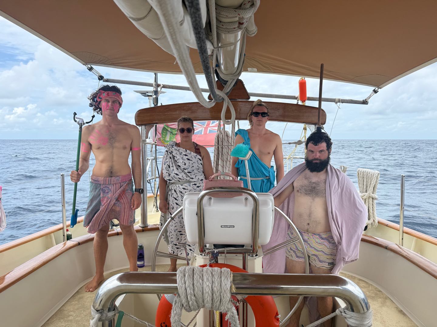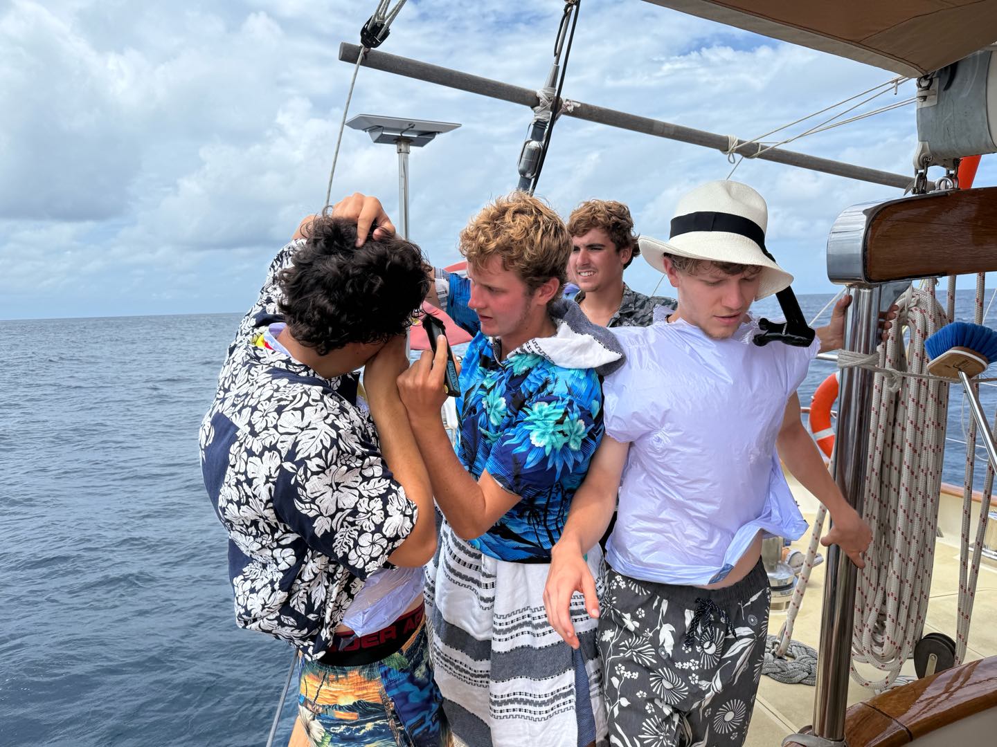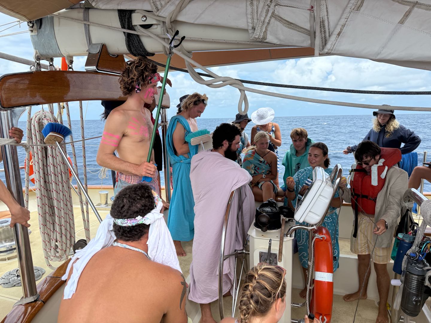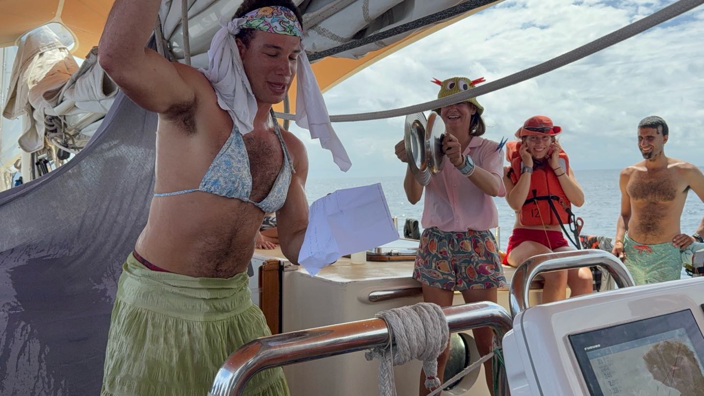 What is up, my loyal readers? Today was a pretty eventful day. We finally crossed the Equator. Which is why I have been selected to write this blog, they needed someone with the necessary skills required to represent the festivities of today (it was simply my day to be skipper). I started my day, technically, on the 12:00 – 4:00 AM watch. It was very chill, as watch team 3 is the chillest of the watch teams. After that, I went to bed. End of Blog Nah, just playin’ gotchu guys. I woke up for lunch, which is exactly when I learned I was skipper for the day. After lunch, we were informed by Captain Nick of the ensuing festivities. In order for us pollywogs to become shellbacks, we had to enter a series of trials to appease Neptune’s court. If that sentence doesn’t make any sense to some people it prolly means you’re a pollywog and I can’t be seen talking to you. Anywho, for my skill, I performed “Hamlet as told on the streets,” which my family will certainly understand, and if you don’t, then I can’t be seen talking to you. Everyone had great performances, and all of us pleased Neptune. After our performances were rated by Neptune and his cronies, we were then sent into our next trials. These consisted of a slip’n’slide on deck, being baptised by Neptune, and bobbing for apples in the dishy pit. Finally, we reached the moment we had all been waiting for. It was time to physically cross the Equator, but we were not going to be sailing or motoring across, that would be far too mundane for any Sea|Mester crossing. No, we were to swim it. So, Captain Nick gave the order to put on the ladder and jump into the middle of the Pacific Ocean. So that’s exactly what we did. It was amazing. You guys realize what kind of bragging rights this gives me? I’m officially better than almost everyone. I, and I guess my fellow crew on Argo, have officially swam across the Equator. Pollywogs no longer. Once we got back on Argo, we wrapped up the day with a lovely meal cooked by our head chef, Colby. Today totally ruled.