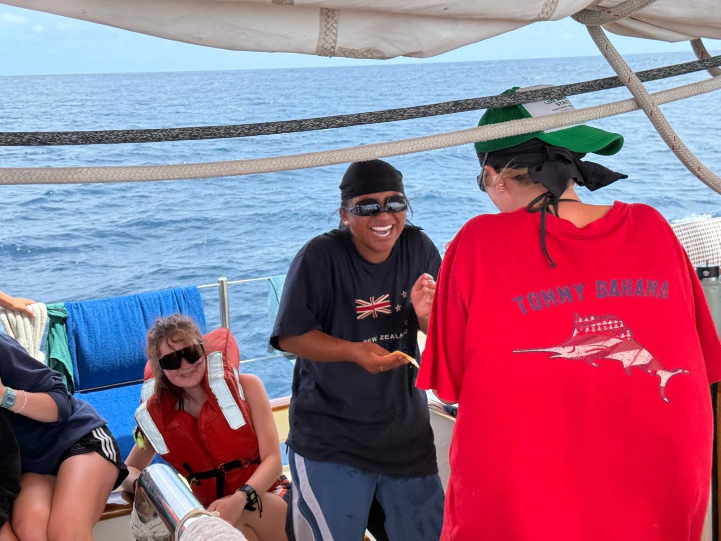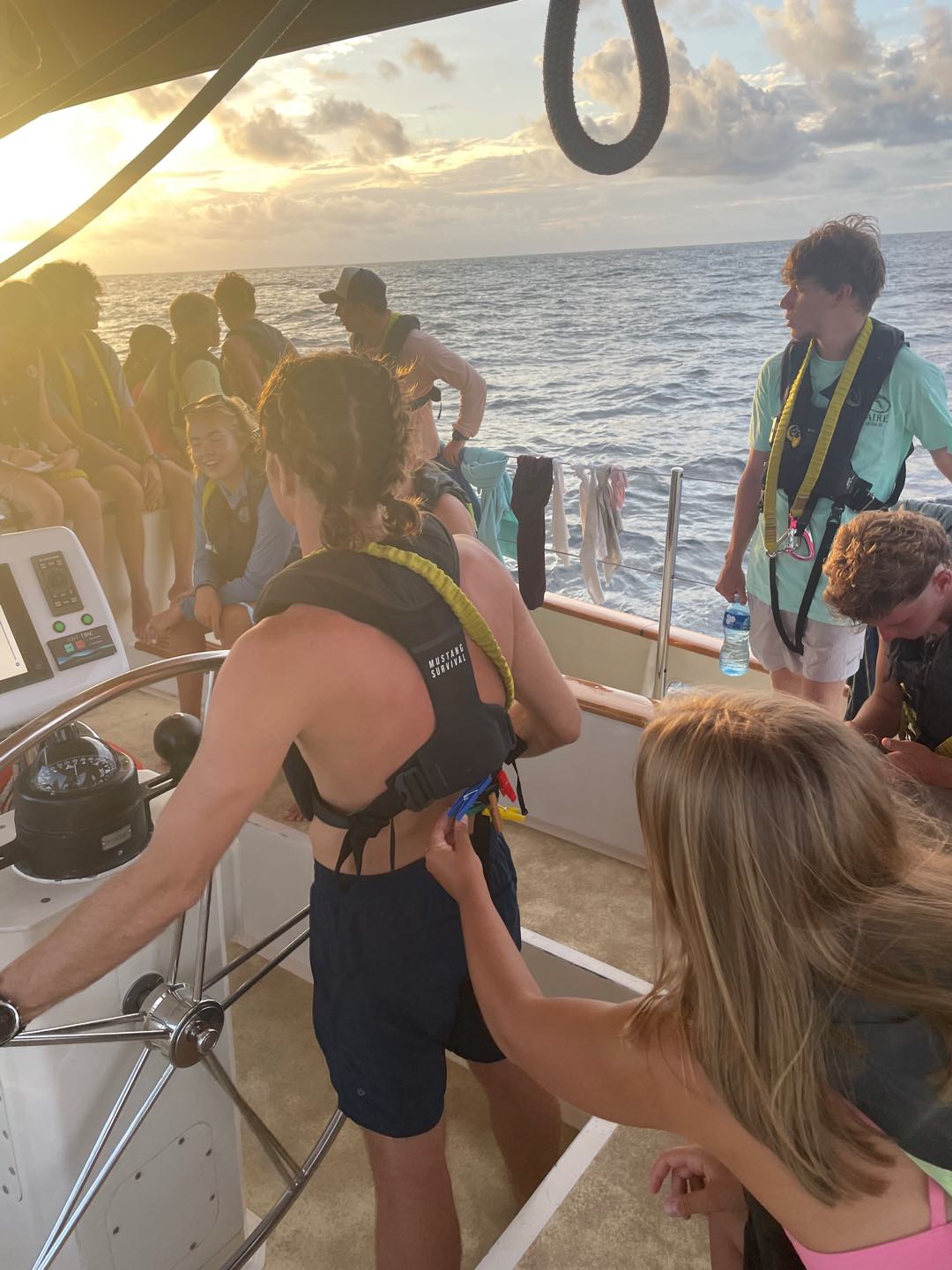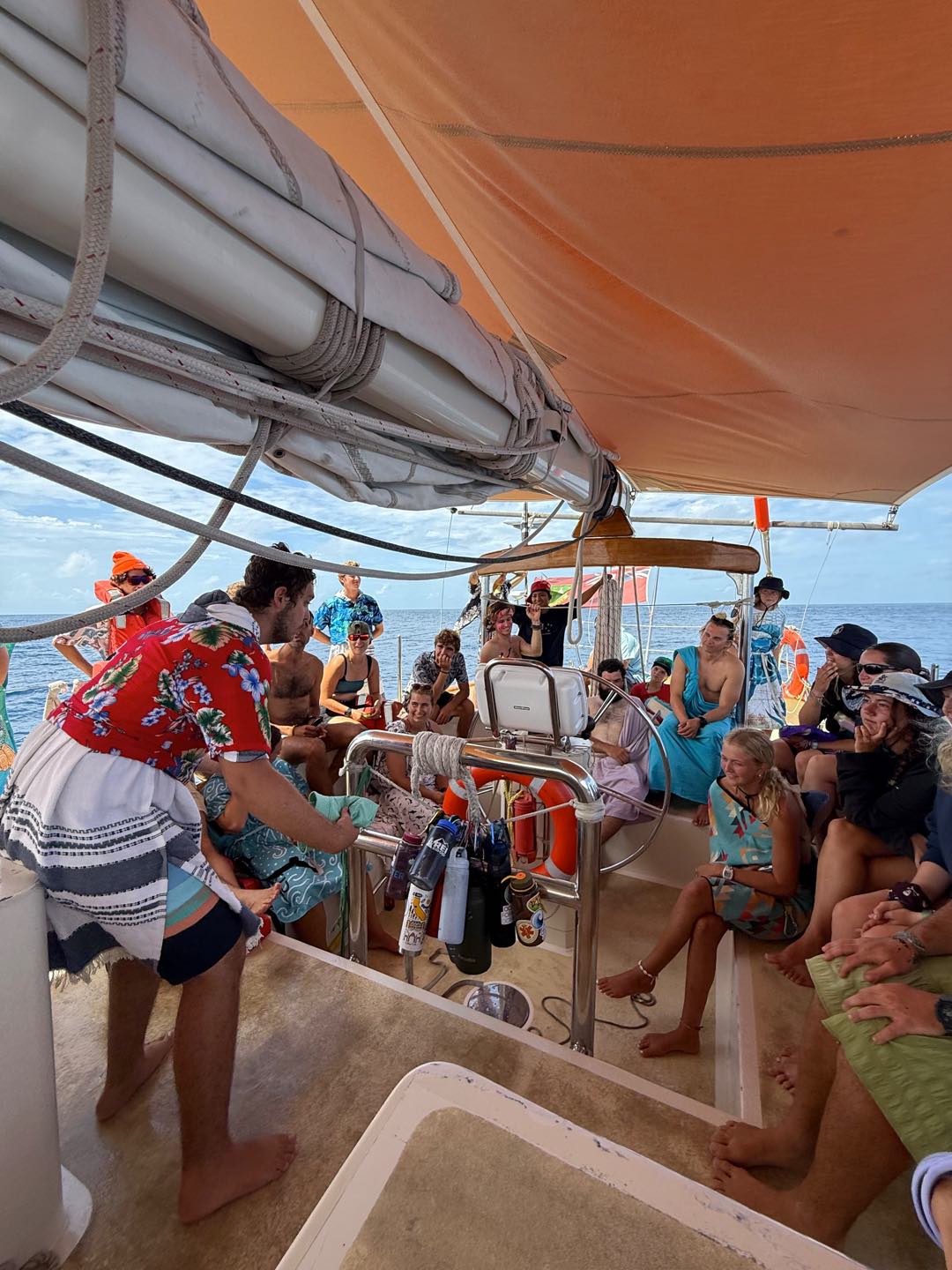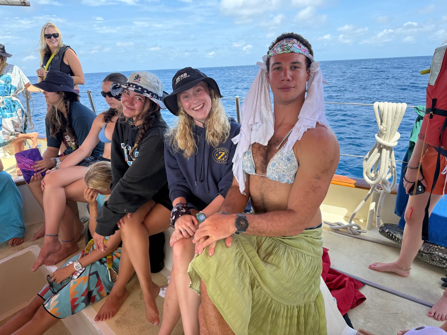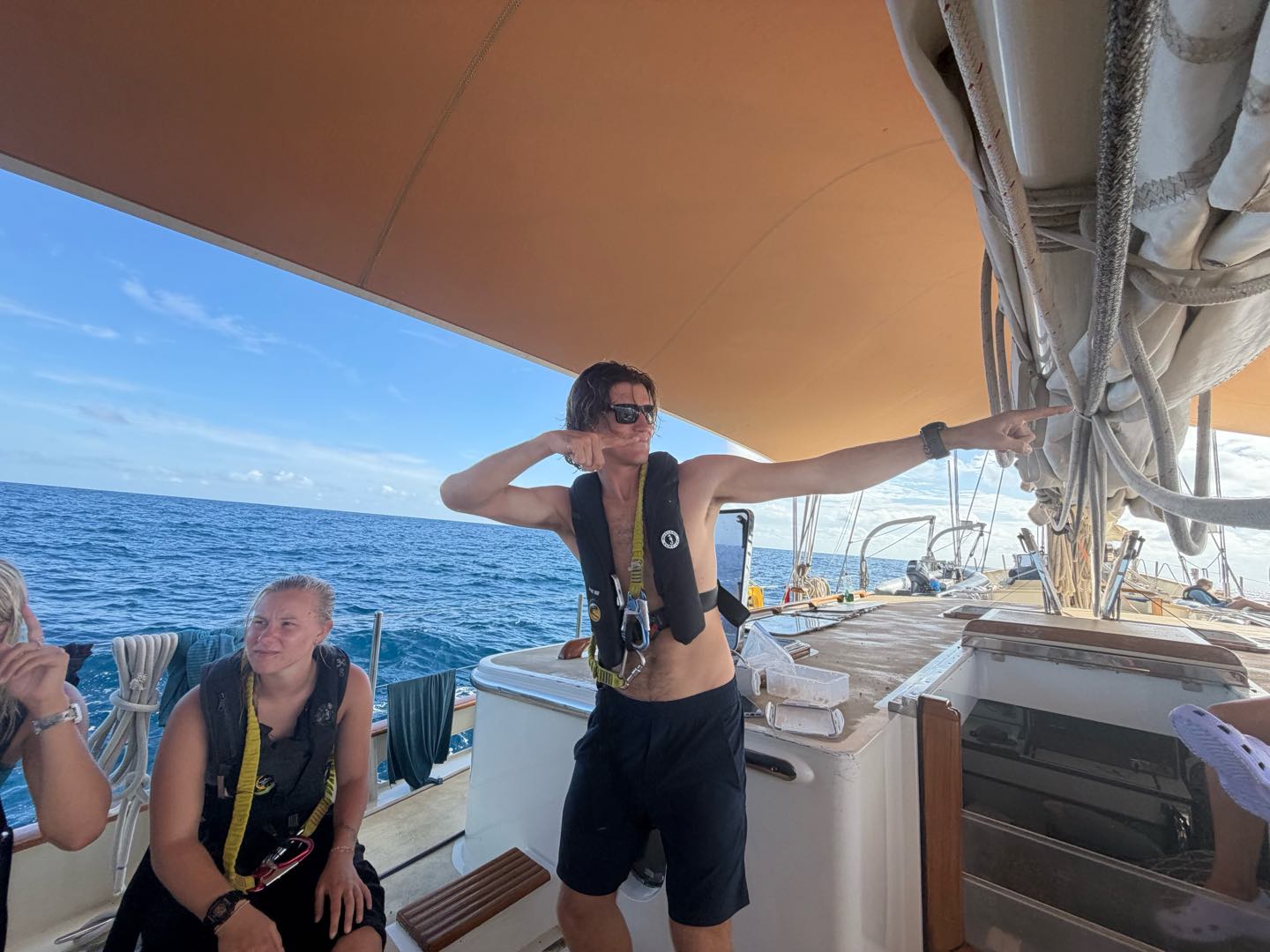 What is up, my loyal readers? Today was a pretty eventful day. We finally crossed the Equator. Which is why I have been selected to write this blog, they needed someone with the necessary skills required to represent the festivities of today (it was simply my day to be skipper). I started my day, technically, on the 12:00 – 4:00 AM watch. It was very chill, as watch team 3 is the chillest of the watch teams. After that, I went to bed. End of Blog Nah, just playin’ gotchu guys. I woke up for lunch, which is exactly when I learned I was skipper for the day. After lunch, we were informed by Captain Nick of the ensuing festivities. In order for us pollywogs to become shellbacks, we had to enter a series of trials to appease Neptune’s court. If that sentence doesn’t make any sense to some people it prolly means you’re a pollywog and I can’t be seen talking to you. Anywho, for my skill, I performed “Hamlet as told on the streets,” which my family will certainly understand, and if you don’t, then I can’t be seen talking to you. Everyone had great performances, and all of us pleased Neptune. After our performances were rated by Neptune and his cronies, we were then sent into our next trials. These consisted of a slip’n’slide on deck, being baptised by Neptune, and bobbing for apples in the dishy pit. Finally, we reached the moment we had all been waiting for. It was time to physically cross the Equator, but we were not going to be sailing or motoring across, that would be far too mundane for any Sea|Mester crossing. No, we were to swim it. So, Captain Nick gave the order to put on the ladder and jump into the middle of the Pacific Ocean. So that’s exactly what we did. It was amazing. You guys realize what kind of bragging rights this gives me? I’m officially better than almost everyone. I, and I guess my fellow crew on Argo, have officially swam across the Equator. Pollywogs no longer. Once we got back on Argo, we wrapped up the day with a lovely meal cooked by our head chef, Colby. Today totally ruled.