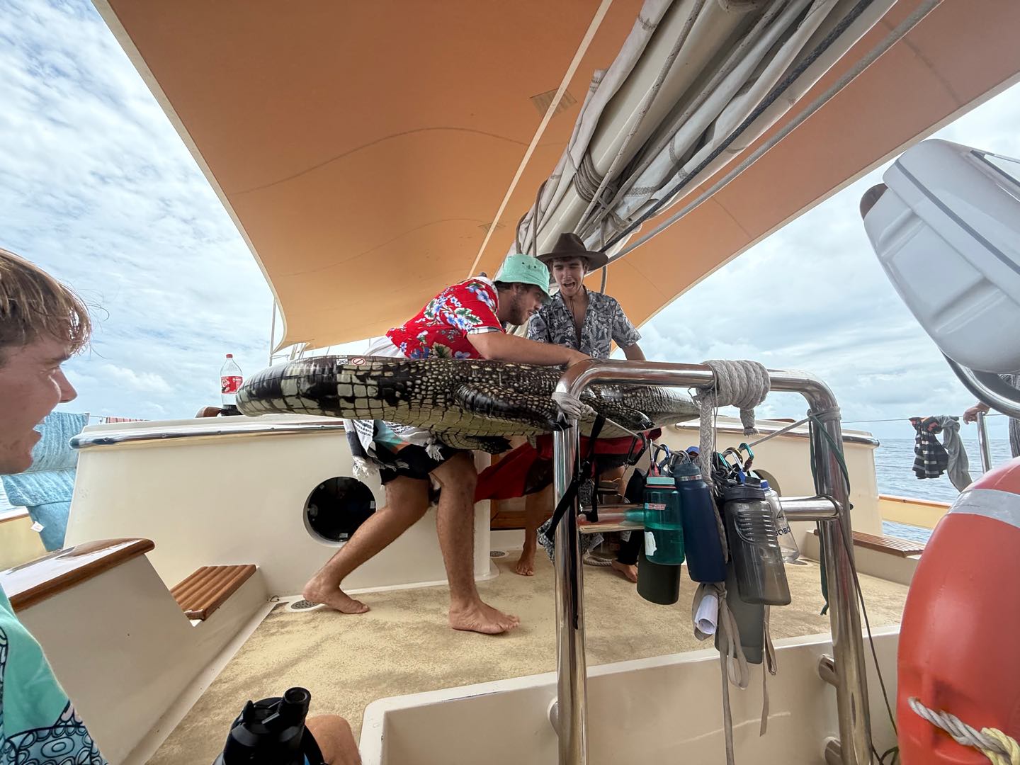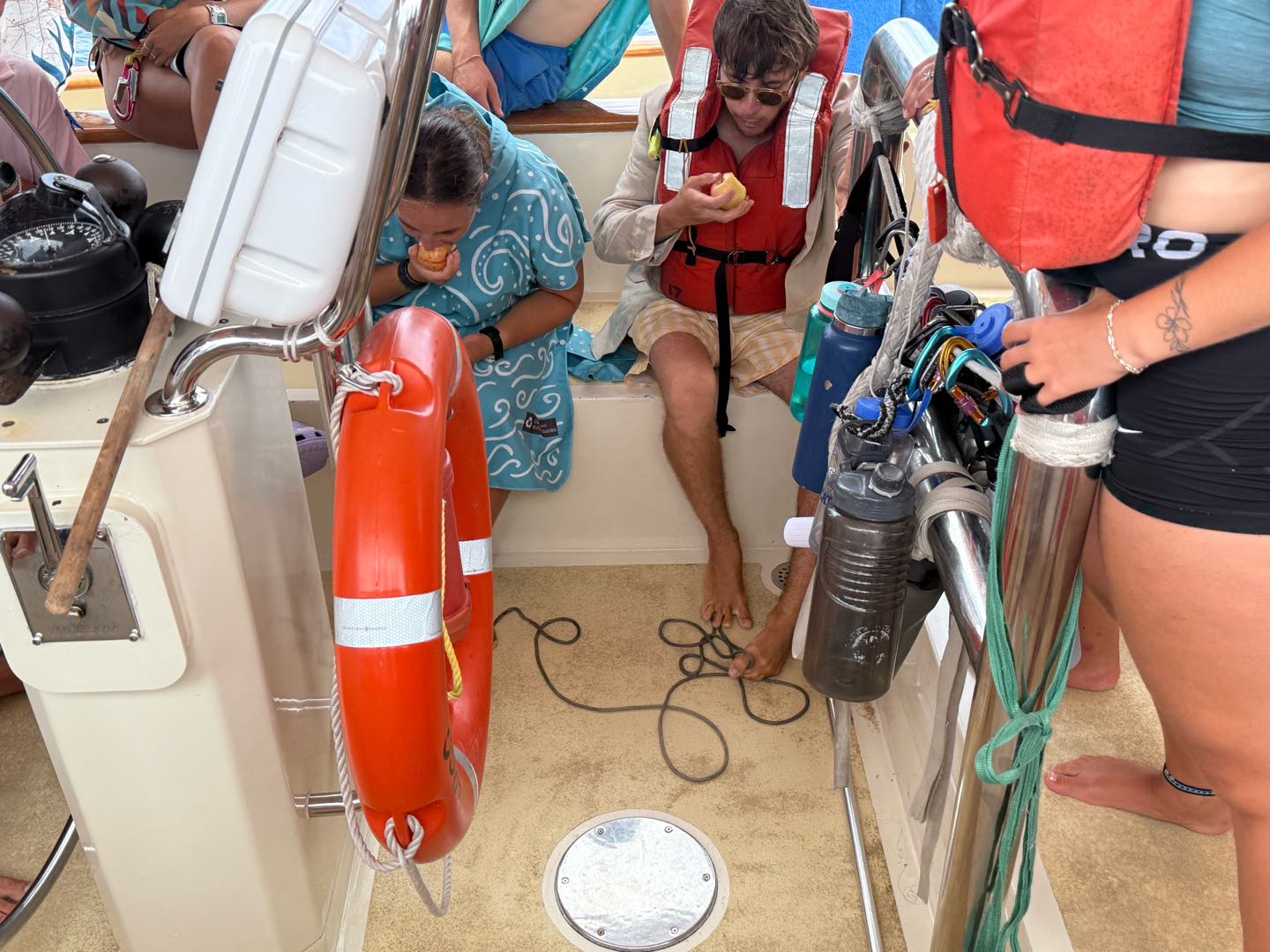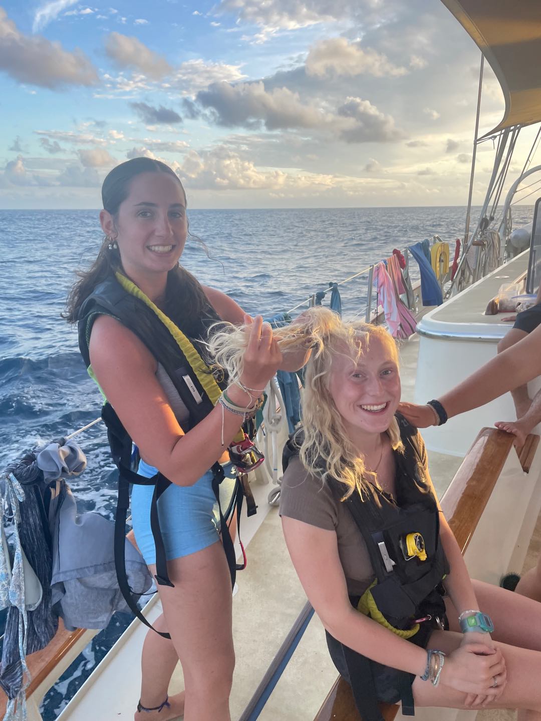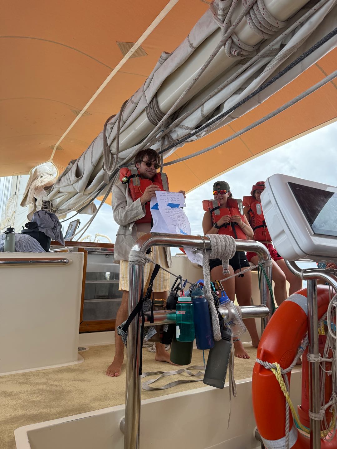 What is up, my loyal readers? Today was a pretty eventful day. We finally crossed the Equator. Which is why I have been selected to write this blog, they needed someone with the necessary skills required to represent the festivities of today (it was simply my day to be skipper). I started my day, technically, on the 12:00 – 4:00 AM watch. It was very chill, as watch team 3 is the chillest of the watch teams. After that, I went to bed. End of Blog Nah, just playin’ gotchu guys. I woke up for lunch, which is exactly when I learned I was skipper for the day. After lunch, we were informed by Captain Nick of the ensuing festivities. In order for us pollywogs to become shellbacks, we had to enter a series of trials to appease Neptune’s court. If that sentence doesn’t make any sense to some people it prolly means you’re a pollywog and I can’t be seen talking to you. Anywho, for my skill, I performed “Hamlet as told on the streets,” which my family will certainly understand, and if you don’t, then I can’t be seen talking to you. Everyone had great performances, and all of us pleased Neptune. After our performances were rated by Neptune and his cronies, we were then sent into our next trials. These consisted of a slip’n’slide on deck, being baptised by Neptune, and bobbing for apples in the dishy pit. Finally, we reached the moment we had all been waiting for. It was time to physically cross the Equator, but we were not going to be sailing or motoring across, that would be far too mundane for any Sea|Mester crossing. No, we were to swim it. So, Captain Nick gave the order to put on the ladder and jump into the middle of the Pacific Ocean. So that’s exactly what we did. It was amazing. You guys realize what kind of bragging rights this gives me? I’m officially better than almost everyone. I, and I guess my fellow crew on Argo, have officially swam across the Equator. Pollywogs no longer. Once we got back on Argo, we wrapped up the day with a lovely meal cooked by our head chef, Colby. Today totally ruled.