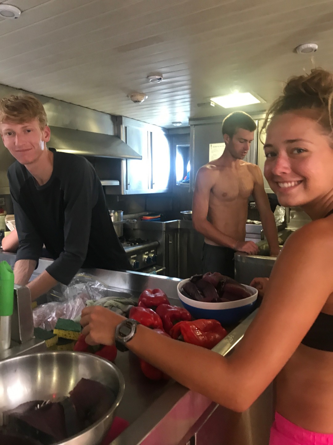 Today, watch team two started off on the morning watch from 8 to 12. About half an hour in, the reel on the fishing rod spun off crazily. It turns out no one on watch team two knows how to fish, so Ben, our captain, jumped in and helped reel the fish in. It probably took 20 minutes and six different people to reel the fish in. Once we got it on deck, we realized it was a skipjack tuna. So everyone who was awake was treated to the freshest tuna sashimi they’ll probably ever get in their lives. Even some of the vegetarians saw it as a once-in-a-lifetime opportunity and tried it (I didn’t keep wishing Mom). The chefs today were Jack, Allie, and Mikaela, who was the head chef. Hugh was our breadmaker today and made some awesome garlic bread and a great birthday cake. They did an awesome job in the galley, making salads for lunch and lemon chicken for dinner, despite how rocky it was. After lunch, most of the crew had an EFR lecture with Simon, where they began to learn about basic first aid and CPR. The Yachtmaster students had a lecture on COLREGS (collision regulations). After class, the people who were not on watch caught up on homework and sleep.