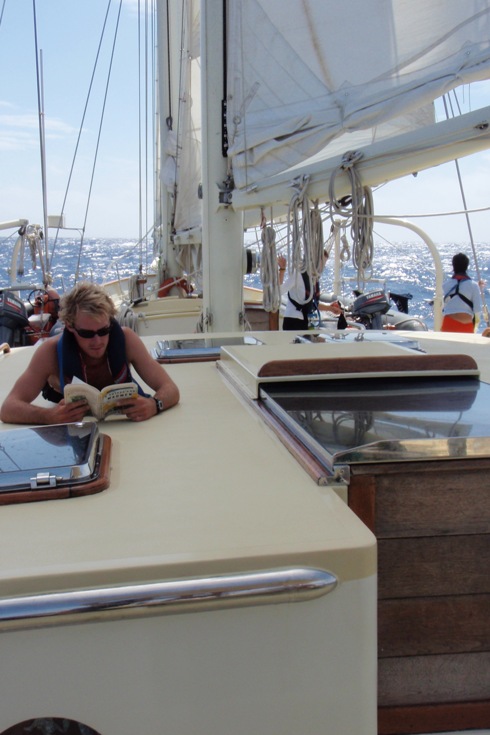 Life at sea is the definition of peaceful. The Southern Ocean provides a constant swell, making your bunk an ever-swinging hammock. The cool trade wind breeze enables us to dress in our cozy fleece and foul weather gear as we watch the starry night pass over our heads. The cleanliness of a mid-passage boat appreciation makes everyone smile. And the smell of fresh-baked French bread reminds us that there is no place like Argo. It is now day eight of our 2400 nautical mile passage across the Indian Ocean, and the crew is enjoying every minute of it. The rhythm of sea life has grown on those who once thought of themselves as land lovers. Who needs a dining room table to enjoy a meal with 21 of your closest friends when there is a cockpit that fits us perfectly? As the majority of the day is spent in watch teams, mealtime always turns into a social affair. The gophers bring up the prepared meals and set them in the cockpit, where many hands carefully hold the mixed sandwich meat or still warm chili in place against the swell. Chefs then carefully begin making a plate: one scoop of rice, a few spoonfuls of meat, two tortilla shells, a handful of sauted onions and peppers, and maybe a little salsa and cheese to finish off the ideal taco. Laughter quickly fills the cockpit as stomachs fill, and the peacefulness of a mid-ocean sunset adorns the sky. Who wouldn’t ask for a better way to spend your days?