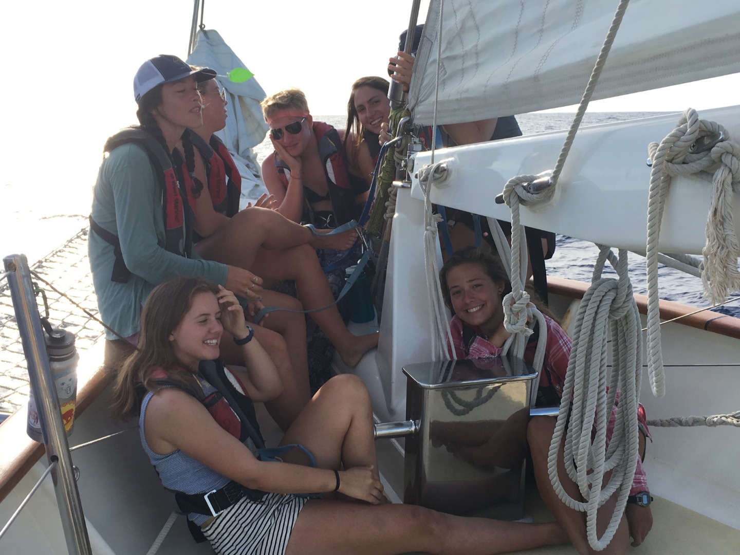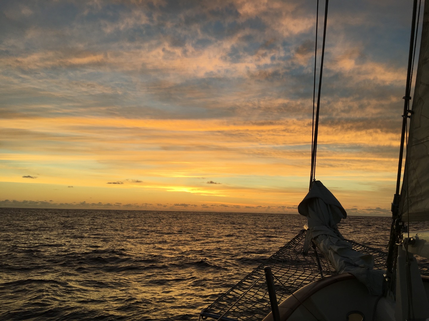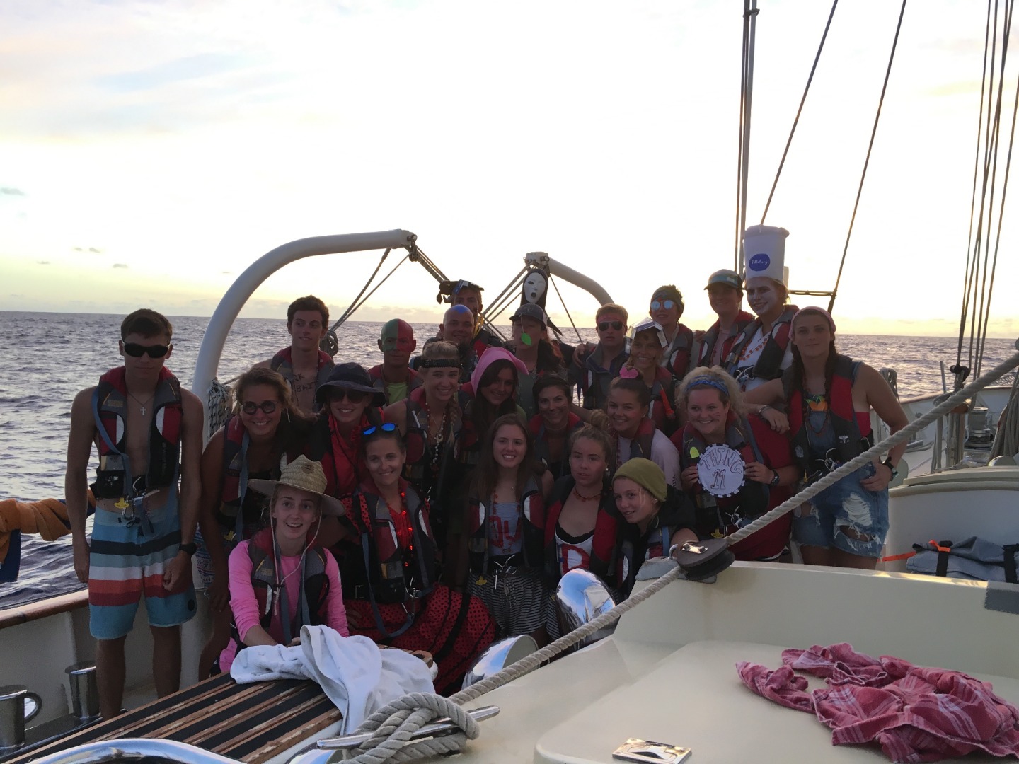 Halloween got off to an early start on Argo. Preparations had been made, and decorations were set up on previous days, but starting on the evening of the 30th of October, costumes started to come on, and people began to scare each other. At midnight, while on bow-watch, a mysterious figure with a canvas bag over its head and a fire ax in its hands approached Caroline and me. It stood staring at us silently for a few minutes without responding to our attempts to communicate with it. Once I asked it if it had been granted permission to use the fire ax as part of a costume, it wandered off, dissuaded. Only later in the morning did we learn that it was Ben, our captain, trying to scare us. Soon after, Nick P. came up on deck and began to shave his head with Matt’s help in order to better resemble Simon, whom he was dressing up as. His commitment to his costume came as a surprise but was greatly appreciated by the whole crew. Once our watch ended at 0400, we began to scare the next watch. Hiding in bilges, behind the hanging foul-weather gear, and in the engine room, we tried to scare watch team three as much as possible. However, once the sun rose, the scares quickly died down. For lunch, we ate the skipjack tuna that had been caught the previous evening and ‘gratin’ style potatoes. Lunch was rife with anticipation as a marine biology test followed it. Fortunately, study resources were abundant, and consequently, most students felt prepared. Fifteen minutes or so after the test, a fire drill began. After only two minutes, everybody was in the cockpit with their type one PFDs on, and after only eight minutes, the fire hose was set up and spraying water. Following this successful fire drill, all the crew was permitted to take showers up on deck. The afternoon was relaxed and open to free time. Many people chose to relax in the salon or nap in their bunks. At 1800 dinner was ready: lasagna. Greeted by a spectacular sunset, everyone enjoyed dinner and, afterward, the brownies that had been prepared by Ally. Given the limited costume resources on Argo, Halloween was a great success, with everyone dressing up to some degree. While not a conventional Halloween by any means, it was certainly one that I will remember.
