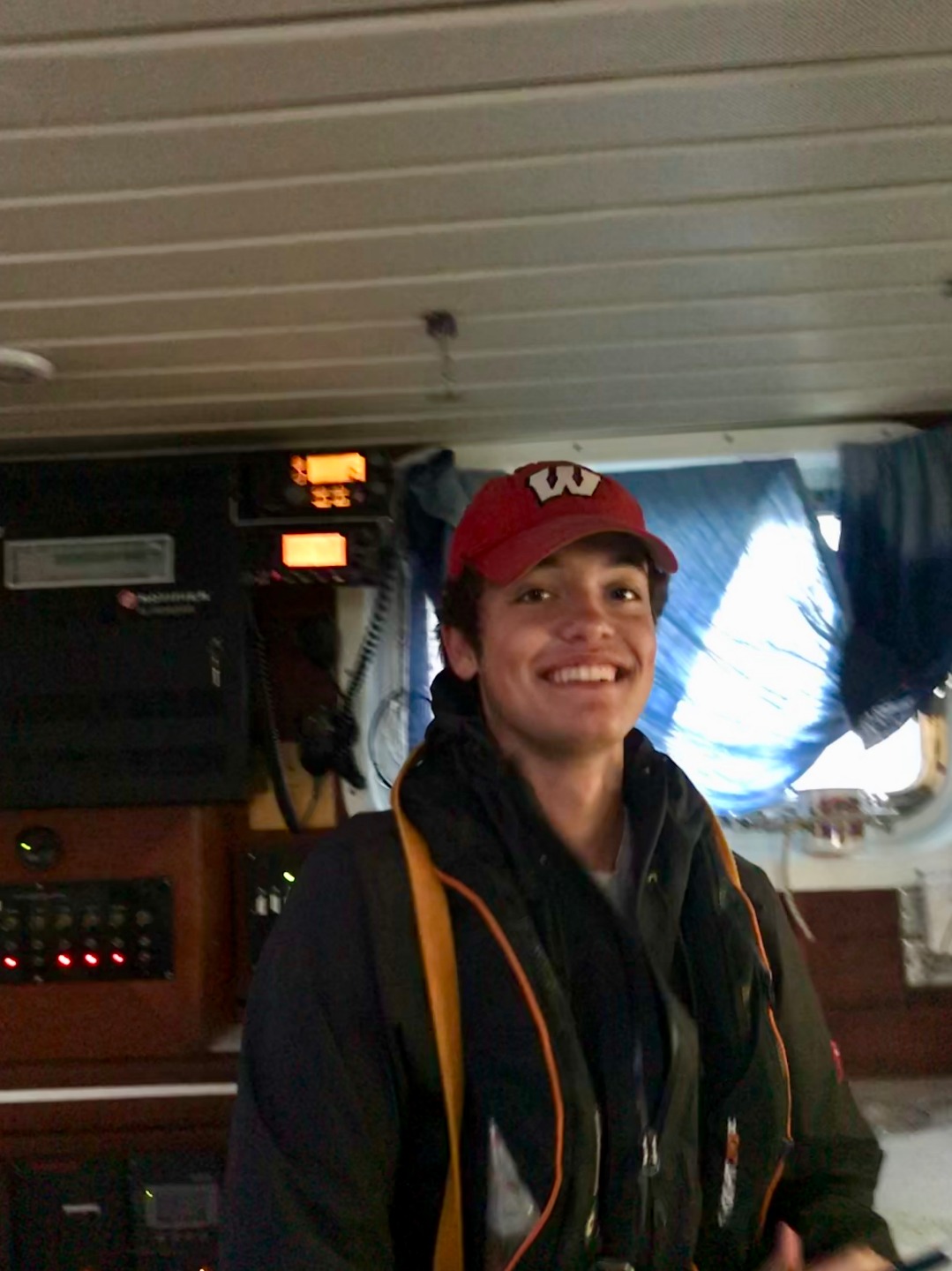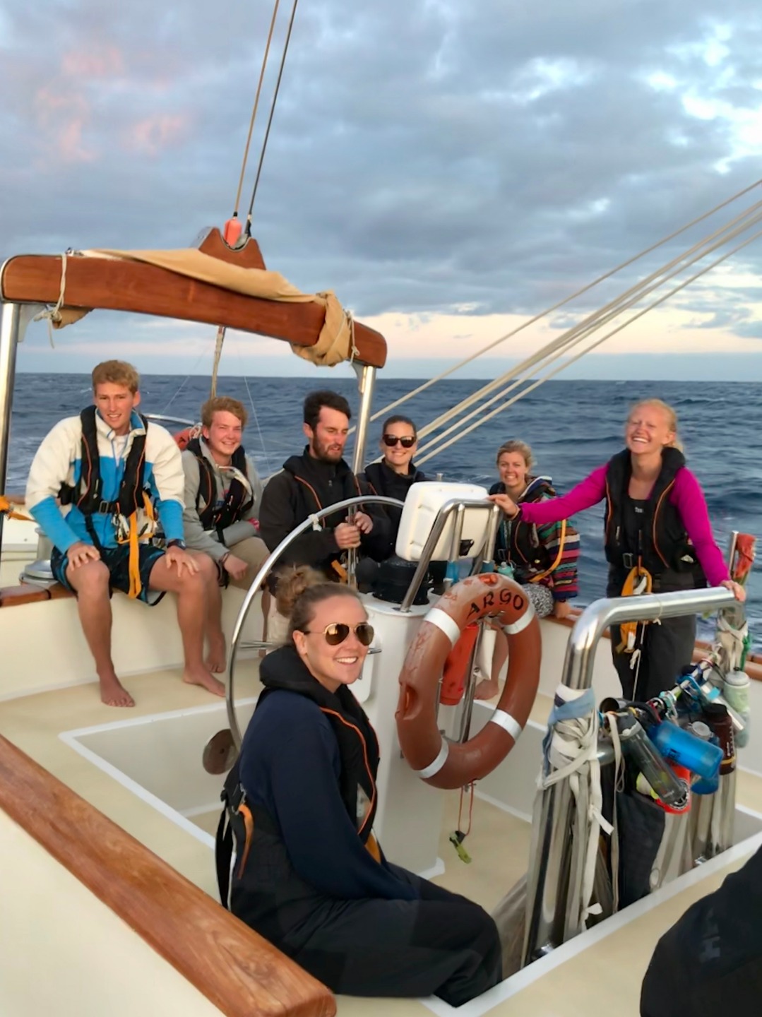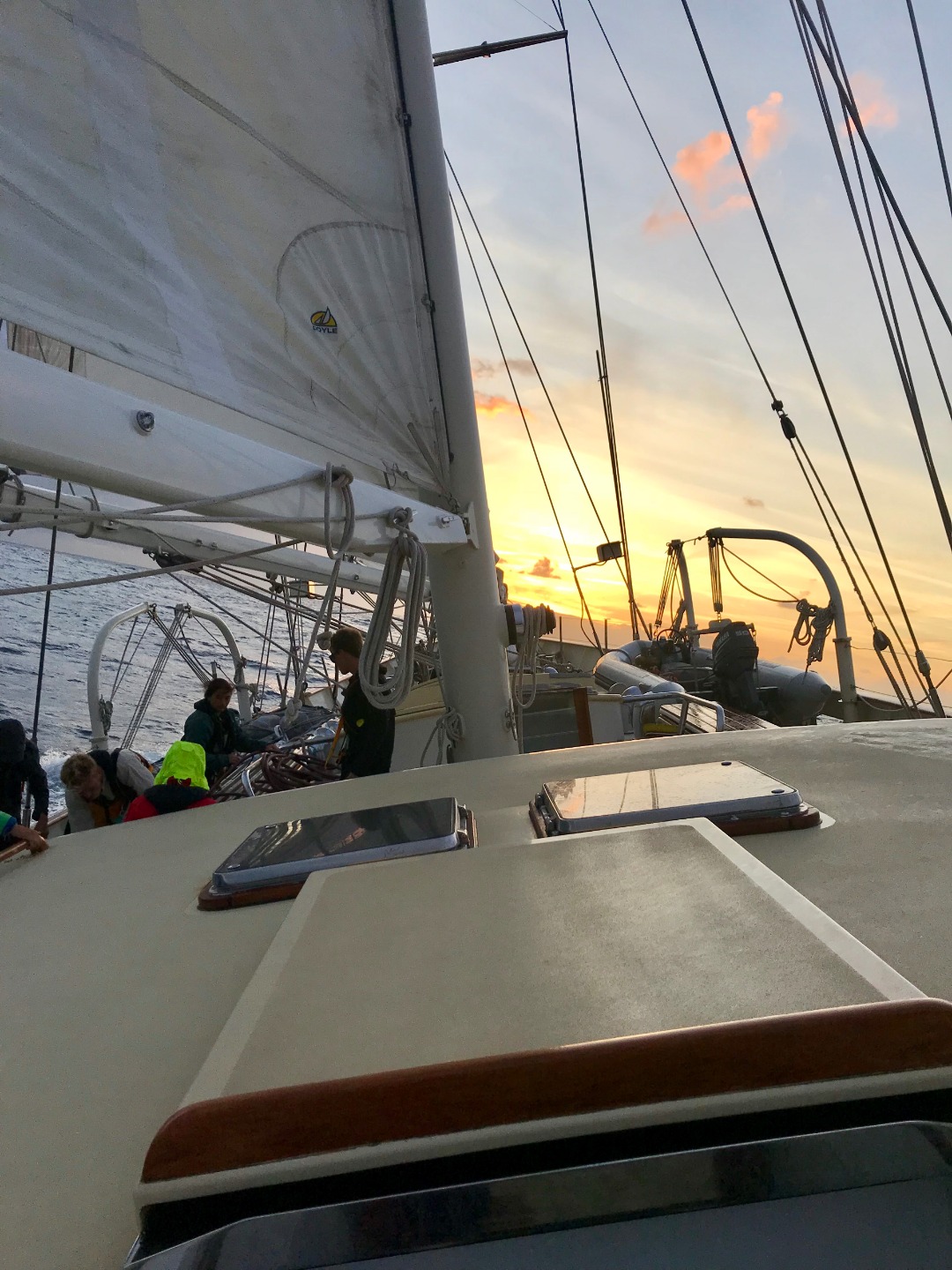 Pictured: Peter smiling in the chart house during a boat check; Ev dressed up with cat ears on for Halloween; some of the crew are smiling in the cockpit; beautiful sunset to end another day on our floating home.