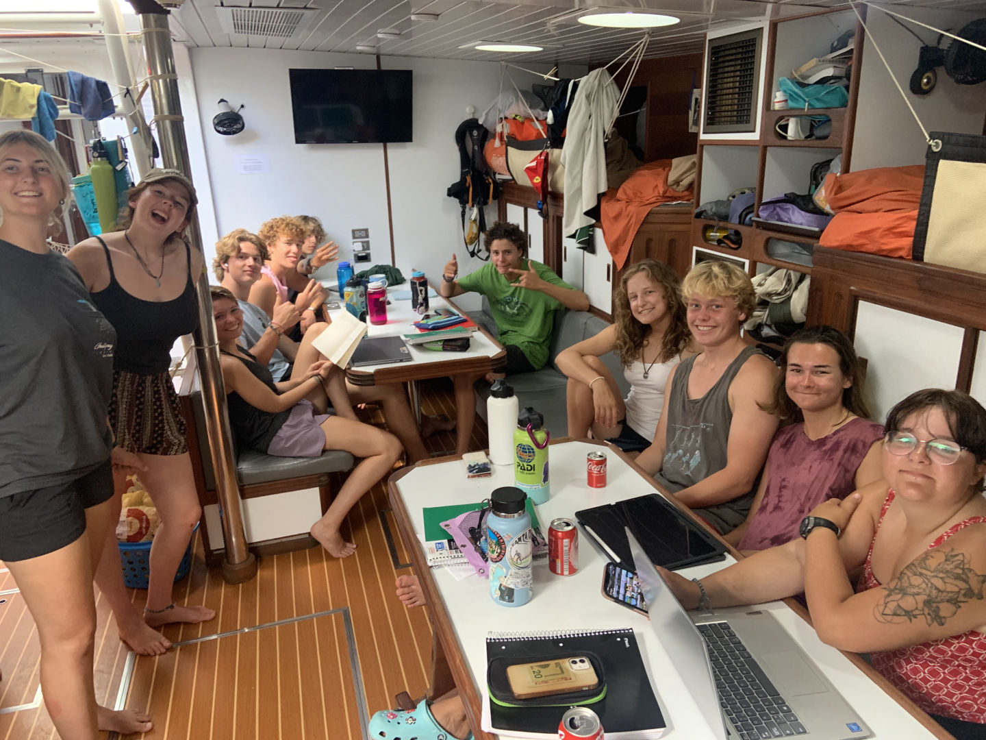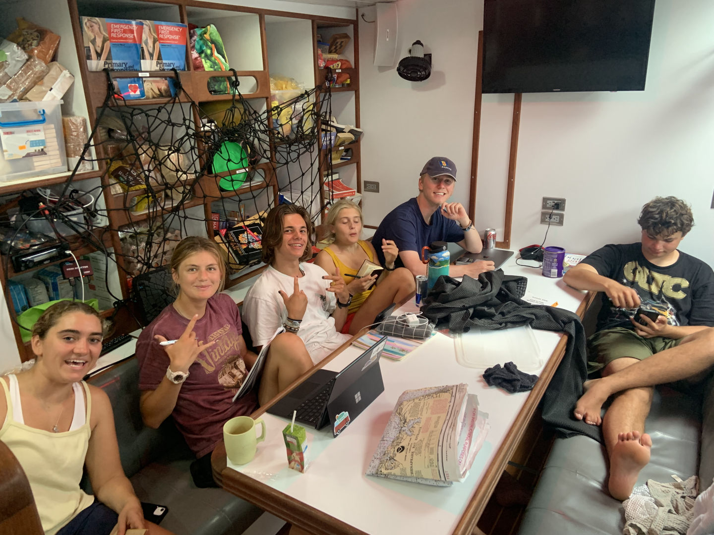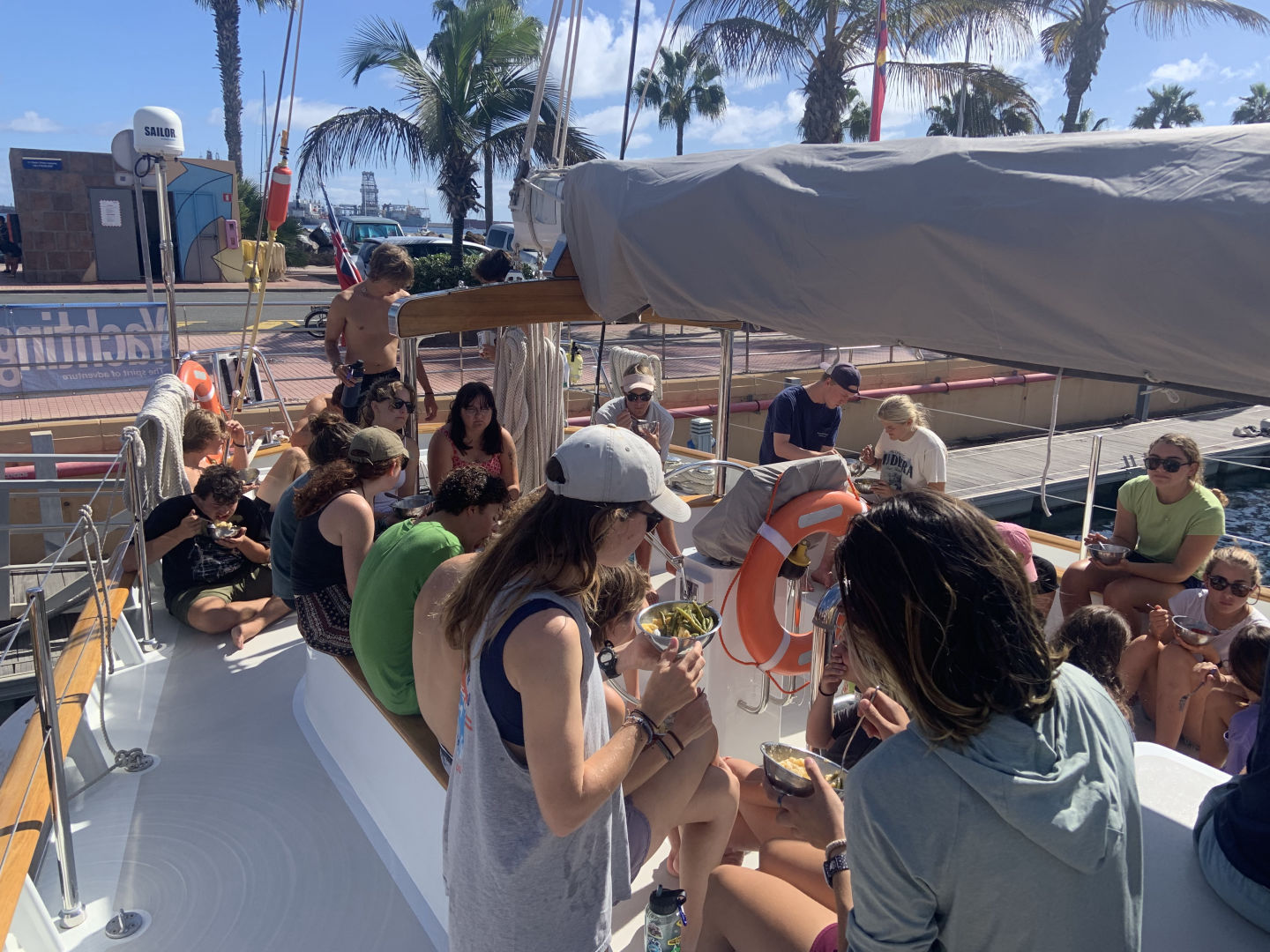 We started this crisp Atlantic day with some sadness. Since we reached the halfway point, we had to switch our watch teams from our original ones. For me, that meant switching from the fabled club 3 to a fresh start on watch team 2 (probably kinda, maybe- we are solidifying it soon). To ring in this switch, we had one last passage with our original teams, which was sad for a lot of us as we had grown accustomed to seeing the same faces during the odd hours of the night. For club 3, it was bittersweet as we danced throughout the night and jammed to our anthem, Dixieland Delight. Watch team 1 ended off the passage by docking us at the port in Gran Canarias. With Allie as head chef, the rest of us awoke to a delicious lunch of oven-baked Mac and cheese and green beans. Classes started with marine bio and then leadership. With our beloved Ash gone, Calum took over the leadership class and started us off with making a playlist that combined a song from each of us, we only got through 10 songs, but we are going to continue working on it when we have class. It was a lit exercise and seeing how each song totally matched the person who chose it was cool. It was also cool to hear a song that didnt mean much to me, but that meant a lot to my friends. After class, we put Vela to sleep and gave her a good salt-away scrub to clean the spray off her.