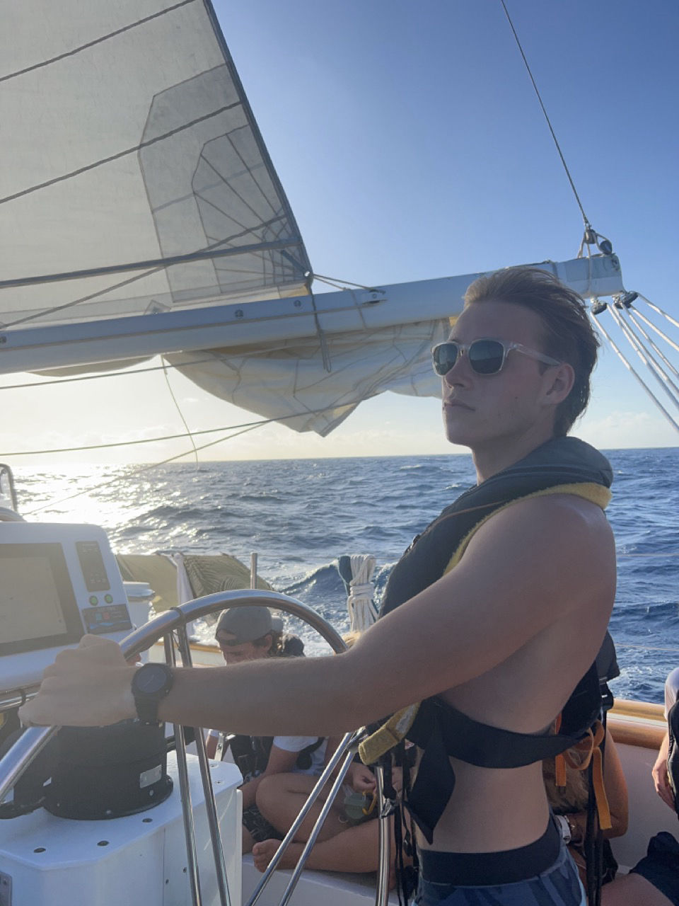 After that, we had an Oceanography lecture and leadership class! Oceanography was nice, it was about shores, and we discussed the rest of the program’s schedule. We have a lot to do, but it’s coming together fast (to my parents, I haven’t missed a single assignment, and the only one I was late on was when I lost my laptop, I had it done on time, I promise). Leadership was fun! It was basically a trivia night about almost everything we’ve talked about on the boat, from Marine Biology and when Seamester started to who on the staff used to have frosted tips (I was the only one to know it was Tom). My team (we were called “Modog,” which was a nickname for me that people are trying to get to stick, I really don’t think it will) was in third the whole time, but we wagered all our points and, like many teams, ended up with zero. After that, we had a long break and had our elections for leadership positions! I imagine many of you will be really excited to learn who got what, so here you go: Ula is our new Skipper, Elise is our engineer, and Gabbie and Toria are our program managers (I have so many ideas to bounce off them. Also Toria wanted to make sure I specified they were called “Tubby,” as they ran together), Skyler is first mate, and Ted is our new Navigator. So if anything goes wrong, blame them (just kidding, obviously). That was everything exciting, though! As I’m writing this above me on deck, Miles just grabbed a flying fish that flew on board and threw it back into the ocean, saving its life, so add that too.