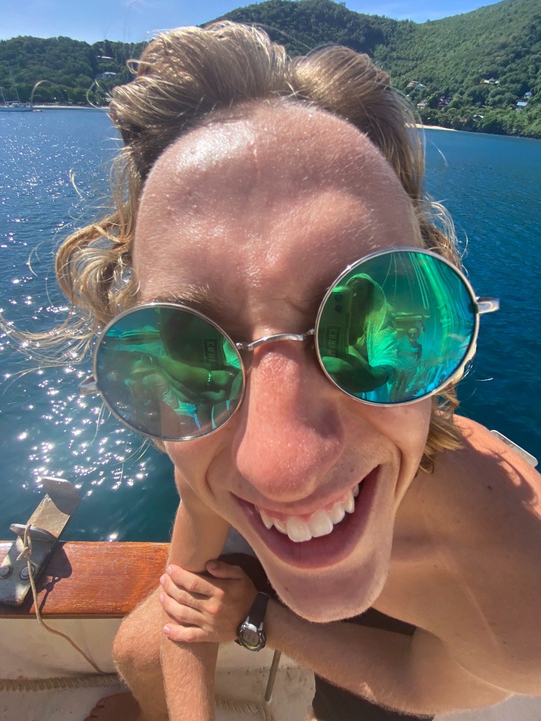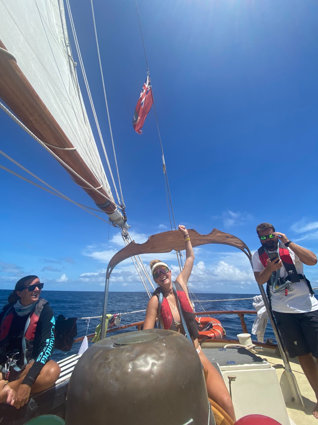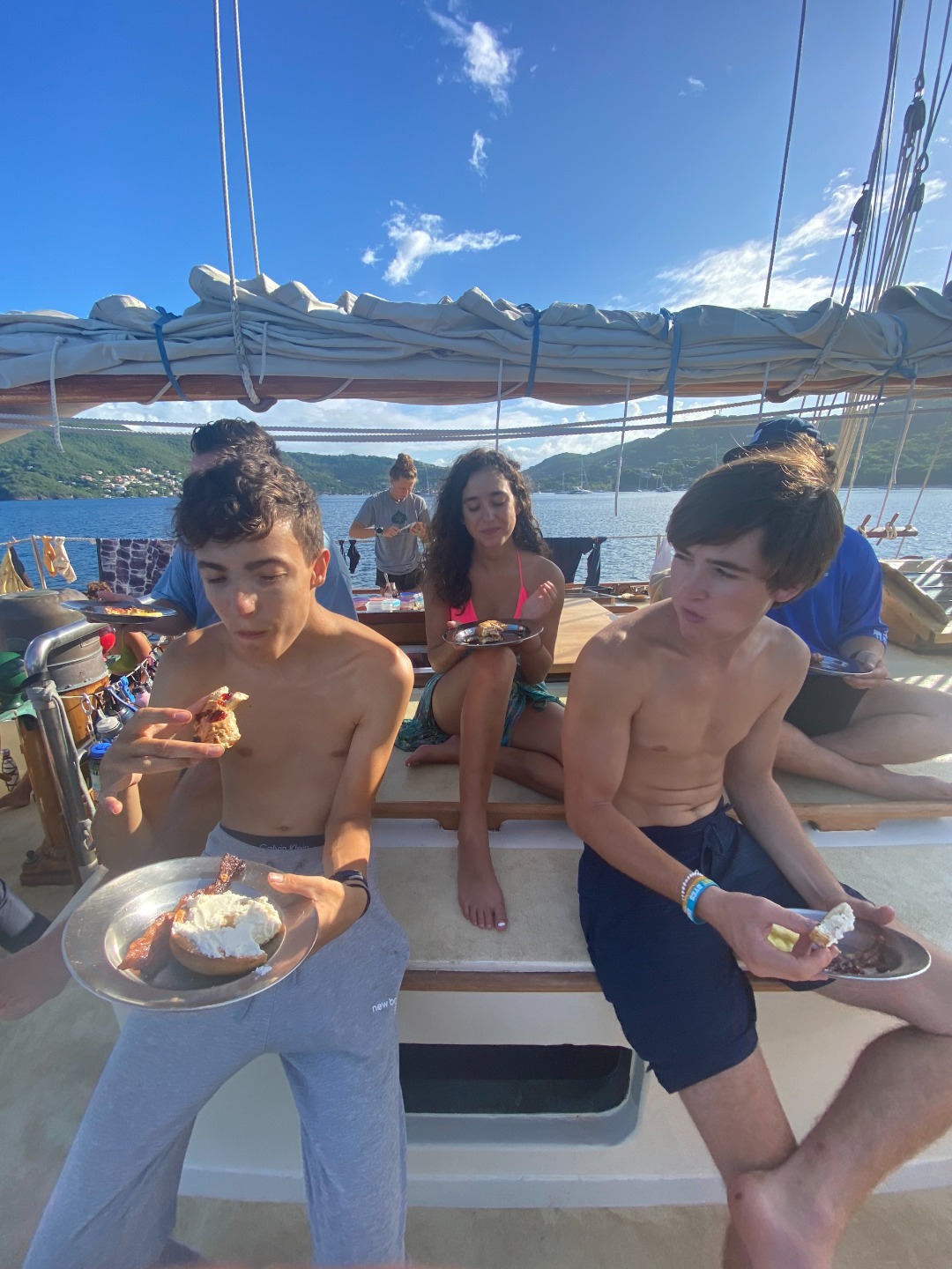 My name is Tate, and today I had the infamous job of the skipper, a role I have been eagerly waiting for. The day started off very bright and early in a beautiful bay off of Bequia. It was the first morning in a while with no rain, so Sophie, Teddy, Steffi, and I soaked it up with some morning yoga/workout routines, followed by our lovely ocean showers in the crystal clear waters. I wanted to wake everyone up in the most pleasant ways possible, so instead of blasting music and clapping in the sleeper’s ears, I softly played The Beatles classic, ‘Here Comes the Sun’ (it felt fitting), brewed a fat pot of coffee for everyone (because who doesn’t love coffee first thing in the morning???) and individually woke everyone up with back rubs and hugs. I think everyone deserves that once in a while. We then enjoyed a bagel, bacon, and fruit breakfast prepared for us by Eamon, Ash, and William Squilliam. After clean-up, we set a course for what we hoped to be Tobago Keys.