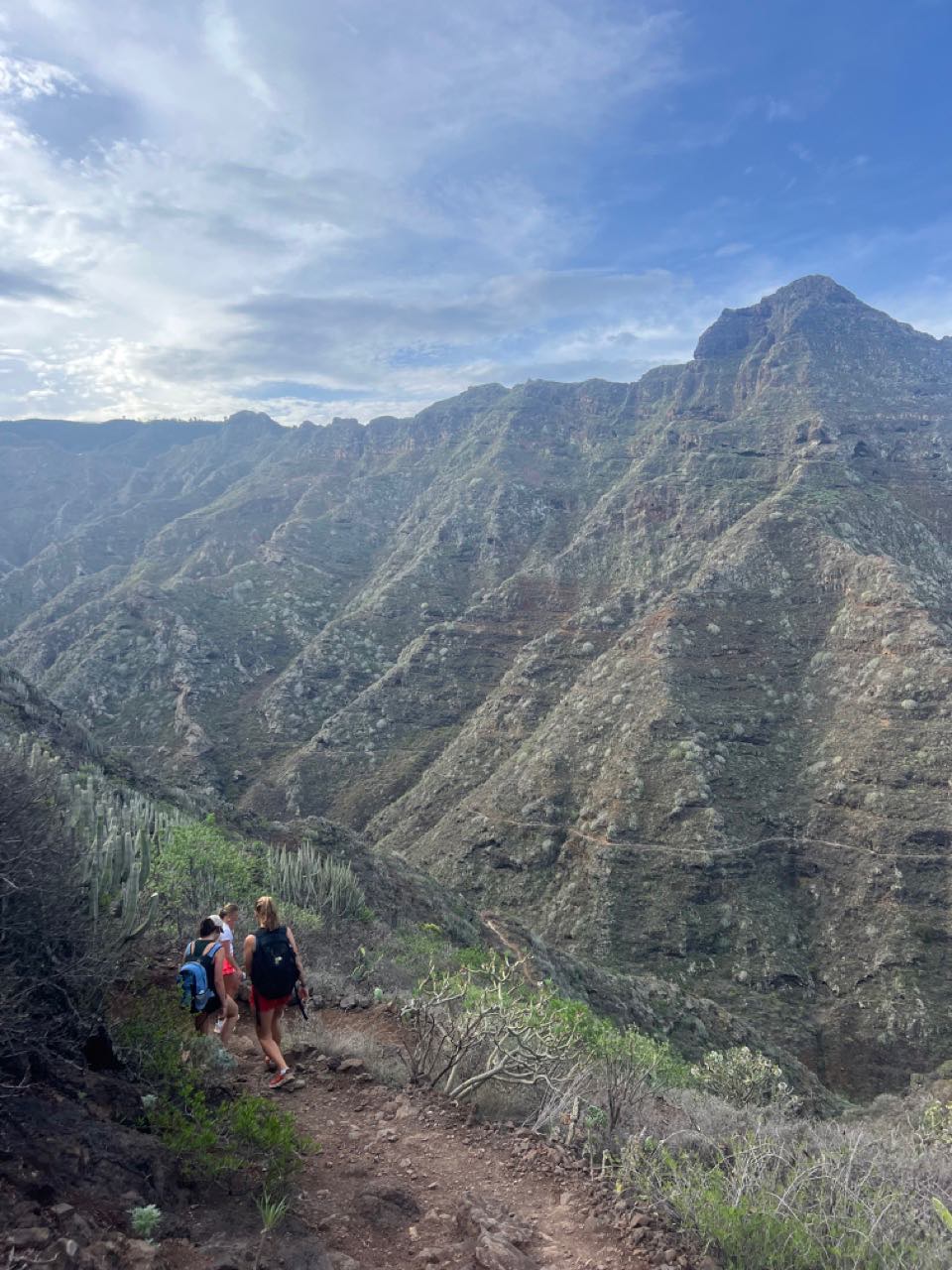 Now, with the way this guy was driving, you’d think he was a professional rally car racer because we were whipping up switchback after switchback into the heights of Tenerife faster than if we had been sent up by trebuchet. Thankfully, the views on the way up through terraced gardens and towering volcanic peaks were still just as beautiful when reduced to a high-velocity blur. After promptly spilling out of the taxi, we snapped a quick group photo at the top and began our hike down into the valley. The hike was extremely beautiful we had endless views out to the ocean and meandered down rocky paths surrounded by cactuses and lush vegetation while gawking at the dramatic slopes of jagged peaks. Those in the group who consider themselves “well-traveled,” which I suppose is all of us by this point in our voyage, said that the environment was pretty like the mountains they had seen in Hawaii or South America. After the hike, we explored the small town below and had lunch in a little caf that we found by the sea.