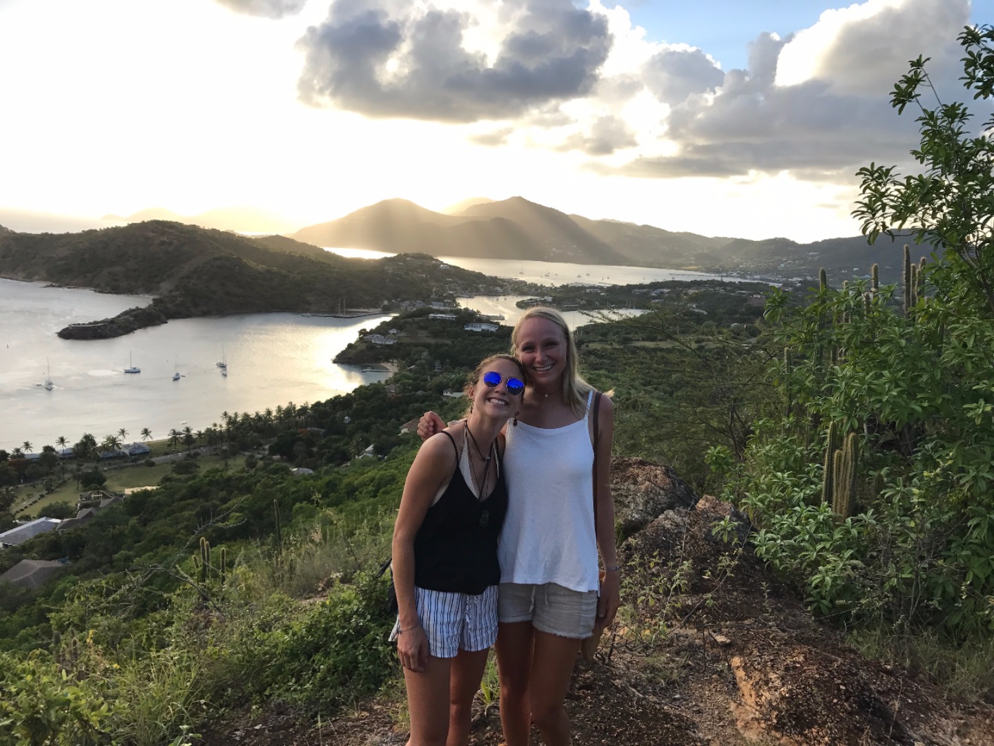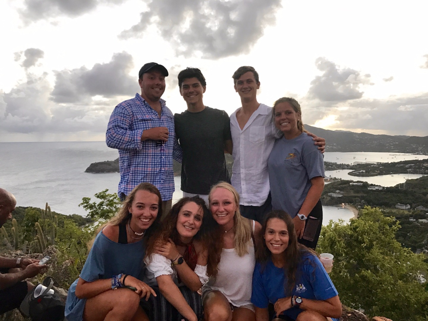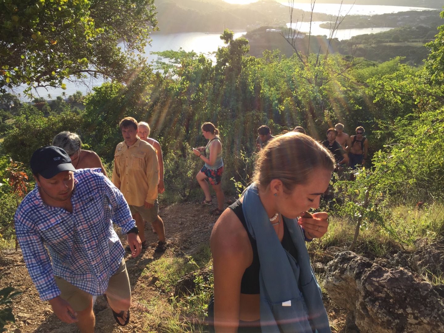 Everyone woke up this morning a little relieved to be able to use the dock bathrooms here in Antigua. After chowing down on Tings delicious French toast, we all got ready for our second day hike of the trip. On the hike, we saw the Pillars of Hercules as well as some tide pools, where we had a mini oceanography lecture on tide pool ecology and the tiny fish that live in them. Two lectures and some fried rice later, we had some time to work on our group research projects and to explore Nelsons Dockyard. After showering in the rain, we all gathered around for the nightly squeeze, where I asked what everyones favorite childhood TV shows were. Notable responses included SpongeBob SquarePants, Dragon Tales, Clifford the Big Red Dog, and Rugrats. Finally, we did an afternoon hike alongside our new dog friend up to Shirley Heights, where I am sitting now, enjoying a cheeseburger, island music, and a beautiful view.