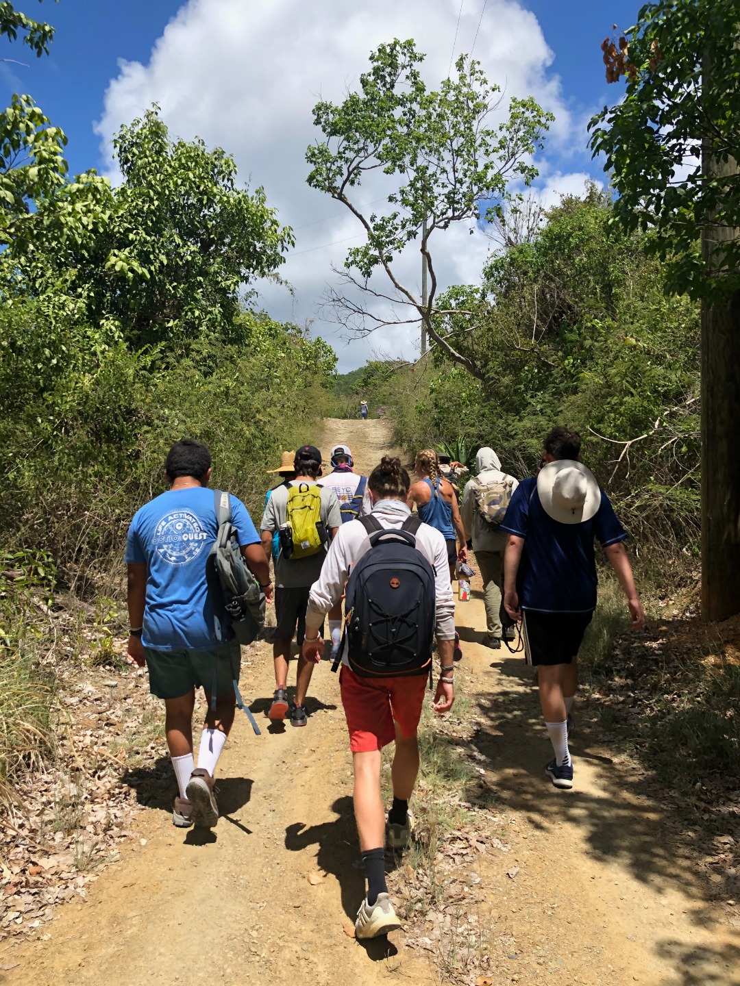 Today was our hike day. We woke up at 7 and had a relaxing morning which featured coffee cake for breakfast. Afterward, we packed backpacks and bag lunch and dinghy-ed over to our hike site on the other side of the island. Our hike site was a reef bay trail in the Virgin Islands National Park. The trail was on the island of St. John- we expected the hike to be a maximum of 3 hours, but because none of us had ever done that hike before, we ended up spending our whole morning there, as well as most of the afternoon. After we finished hiking, we had lunch on the beach until our staff came to pick us up. We only arrived back on the boat around 3:00 pm, but soon decided that we wanted more land time, so we packed up dinner ingredients and had a cookout on the beach. There were a few grills available on the beach that we went to, so our staff manned the grills while we helped layout other food. After dinner, we played volleyball and frisbee in the water, and then came back to the boat for showers.