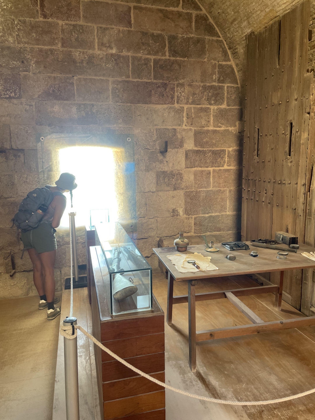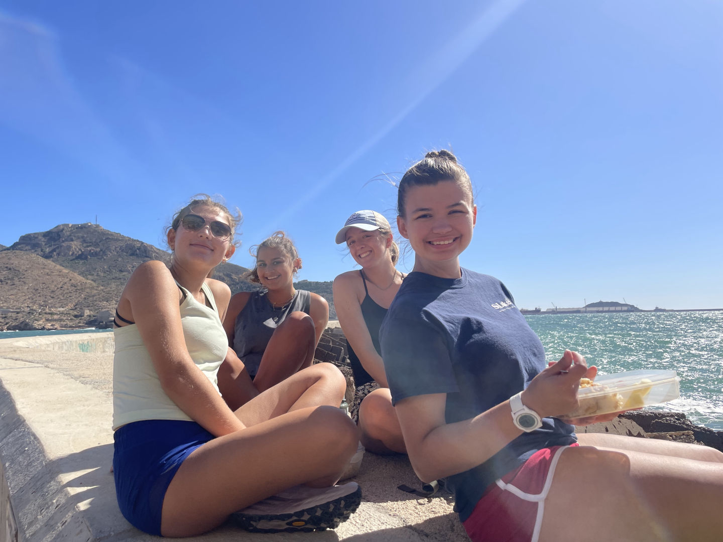 By the time Argo’s salon was looking shiny and her decks freshly washed, we packed some lunches to go and set off on our hike for the day. Destination: Fuerte de Navidad at the entrance of the harbor. We walked along an incredibly tall wall blocking off a military section of the city before following a dried-up river lined with Eucalyptus trees. The road carried us out onto the headland and the fort itself, which sat next to a lighthouse. We had lunch on the break wall with crashing waves on one side and a view of the whole protected bay on the other. Gorgeous stuff! A group of us wandered up to the fort after and watched a quick video on the history of Cartagena as a military port of Spain and its various lighthouses and forts built throughout the centuries. We followed a little staircase up to the lookout and were greeted by a lone standing and fully stocked vending machine! A choch-y milk, iced tea, sparkly water, and some sneaky snackies later, a group of us looked out over the coastline, imagining what it must be like to have stood there in the 1600sdefinitely vending machine-less.