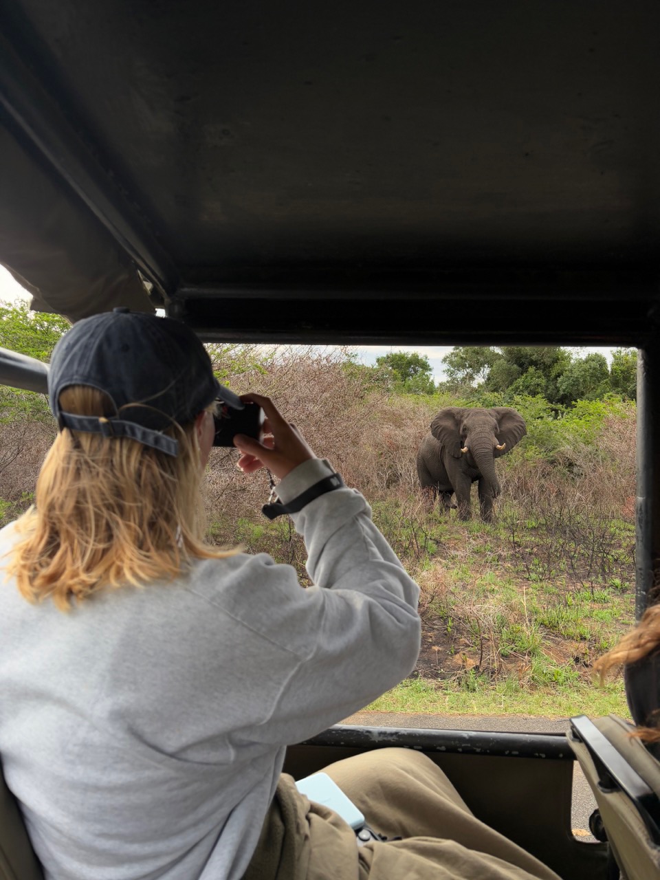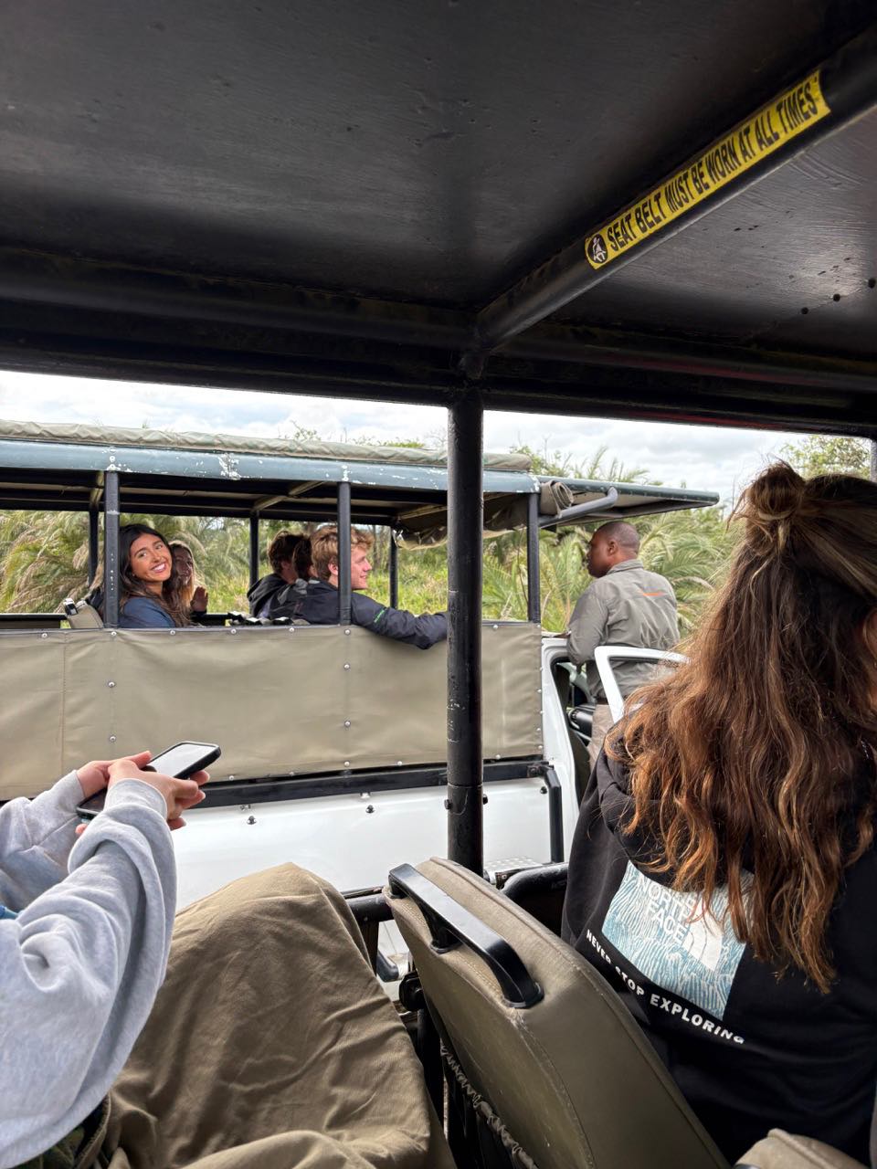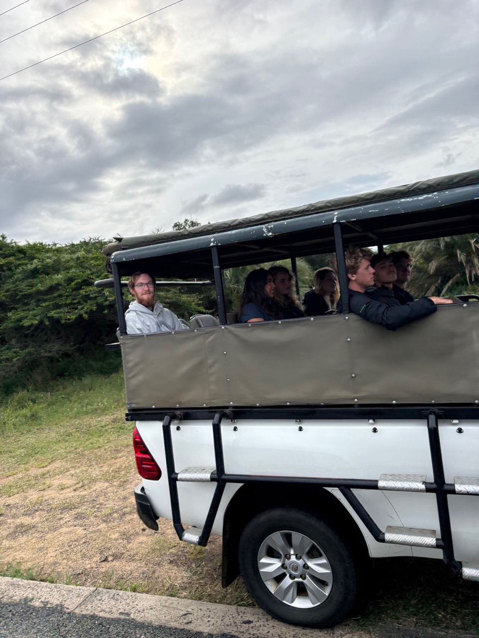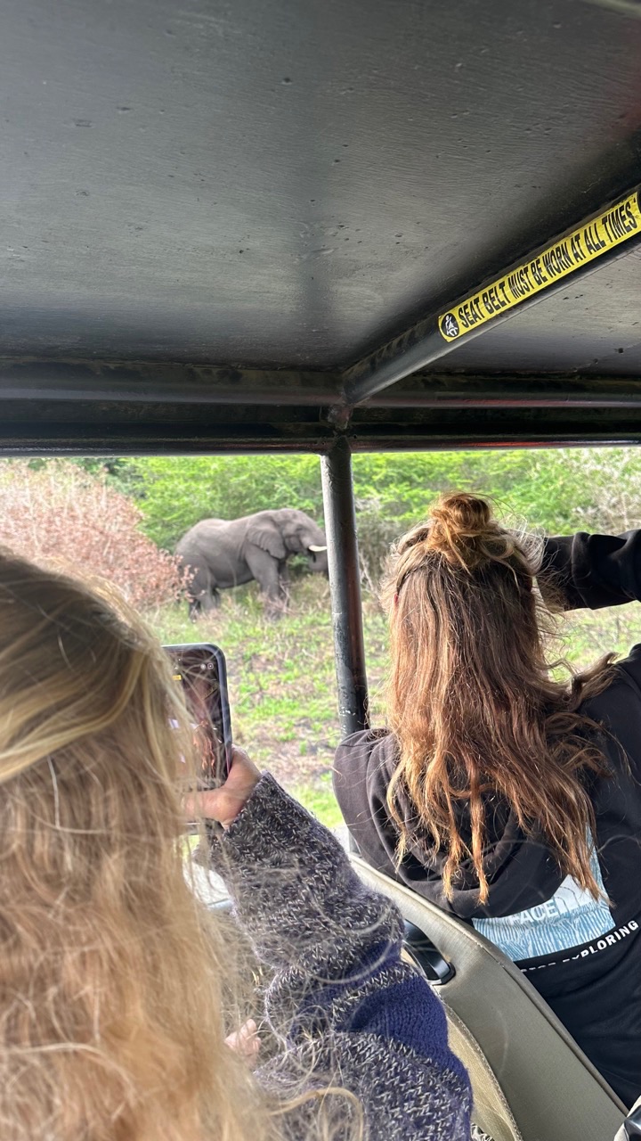 Today we woke up bright and early. Safari time! With a quick breakfast of chilaquiles from head chef Adda, we were up and ready for a big day. We left Port Richard on our buses to get over to Saint Lucia, where we would be spending the night. Maias exquisite aux and Emmas awesome snacks, (and whatever happened in the other bus), made the hour and a half drive feel like nothing. Upon arrival, there was a playground nearby where Destiny, Keith, Rai-Ching, Thaxton, and Hannah swung around on ropes and reminisced about their childhood. There were signs all over the place saying Warning: Hippos that worried us a bit. We then made our way over to the hotel to check in and try to get our rooms. Without successfully getting the rooms, we had some free time, where everyone explored a bit of the town. At some point, Henry and Zeke got haircuts, and Jewel got a new jacket. We made it back with much time to spare, so I ate the sandwich that I prepared earlier that morning… yum. After this, we went on a river cruise where we saw many Hippos. Scarlette, Alice, Fin, and Vera all got some awesome pictures. Now its real safari time. We loaded up in our trucks and set off. We saw Zebras, kudus, Warthogs, impalas, and got super close to this elephant off the road. Halfway through, we settled down off the road to have some coffee, tea, and snacks.