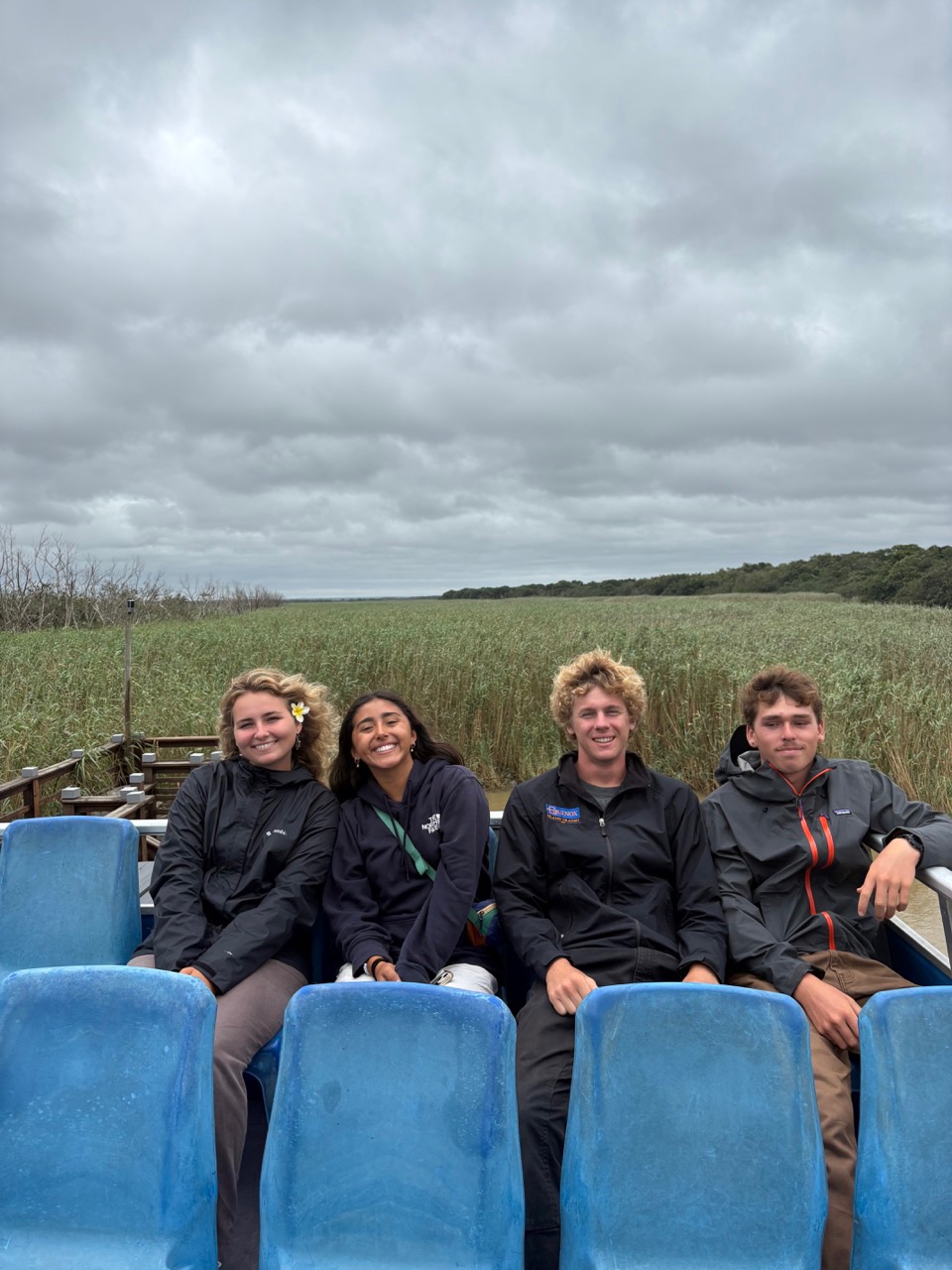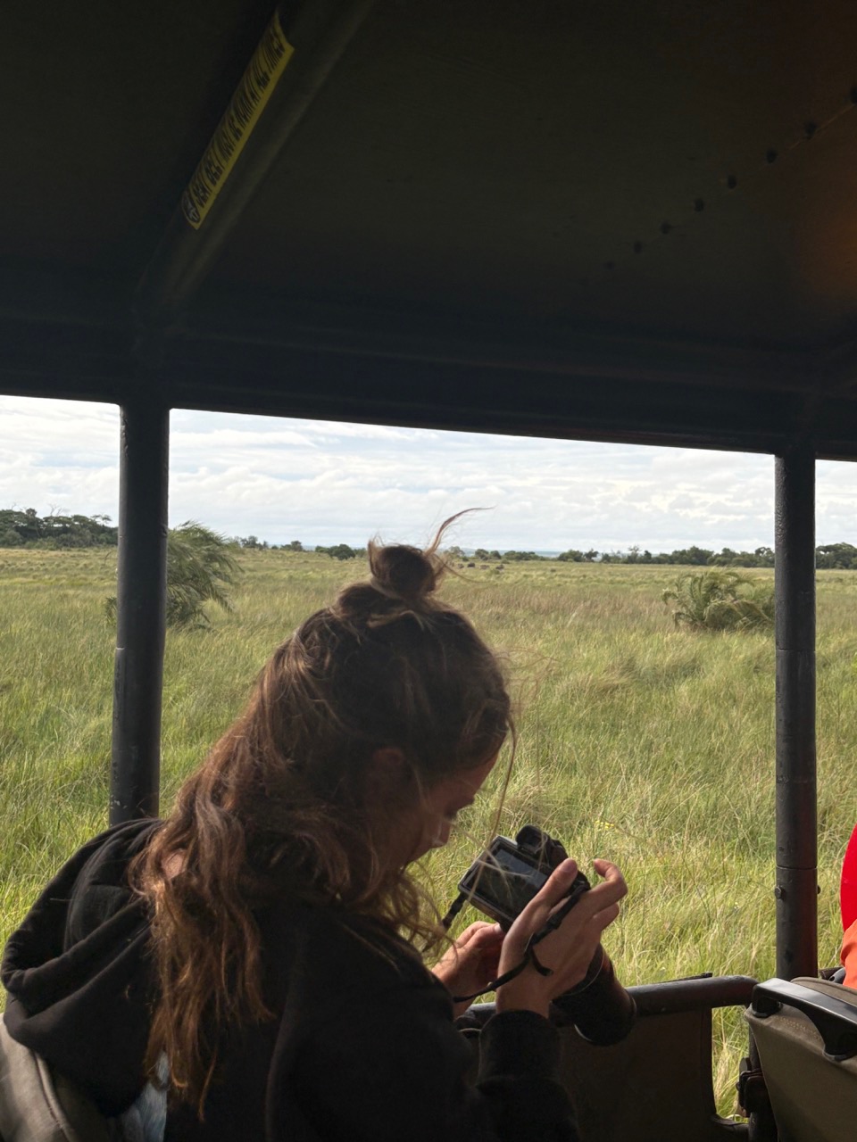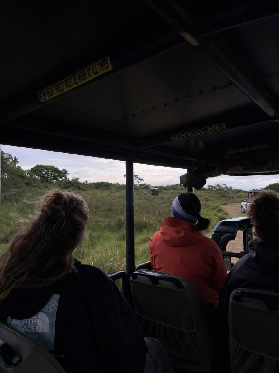 Today we woke up bright and early. Safari time! With a quick breakfast of chilaquiles from head chef Adda, we were up and ready for a big day. We left Port Richard on our buses to get over to Saint Lucia, where we would be spending the night. Maias exquisite aux and Emmas awesome snacks, (and whatever happened in the other bus), made the hour and a half drive feel like nothing. Upon arrival, there was a playground nearby where Destiny, Keith, Rai-Ching, Thaxton, and Hannah swung around on ropes and reminisced about their childhood. There were signs all over the place saying Warning: Hippos that worried us a bit. We then made our way over to the hotel to check in and try to get our rooms. Without successfully getting the rooms, we had some free time, where everyone explored a bit of the town. At some point, Henry and Zeke got haircuts, and Jewel got a new jacket. We made it back with much time to spare, so I ate the sandwich that I prepared earlier that morning… yum. After this, we went on a river cruise where we saw many Hippos. Scarlette, Alice, Fin, and Vera all got some awesome pictures. Now its real safari time. We loaded up in our trucks and set off. We saw Zebras, kudus, Warthogs, impalas, and got super close to this elephant off the road. Halfway through, we settled down off the road to have some coffee, tea, and snacks.