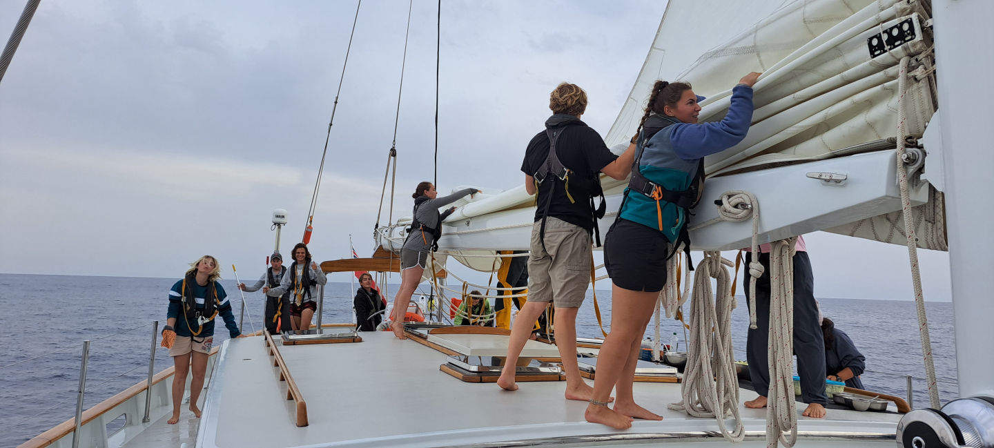 After lunch, half of us where in Nav master class where the other ones could enjoy our free time. Calum, Skyler and Joel installed a fishing line at the back of the boat. Despite Allie’s energy when she thought there might be something, they didn’t catch any fish. During this time, Alison and Zoe were learning the sign language alphabet which they used to communicate for the rest of the day. During marine bio class, we were all trying not to cry. We can’t really tell why. It might be because of the beauty of the under world fish we where leaning about or because or the onion that were cut in the galley.. who knows ?