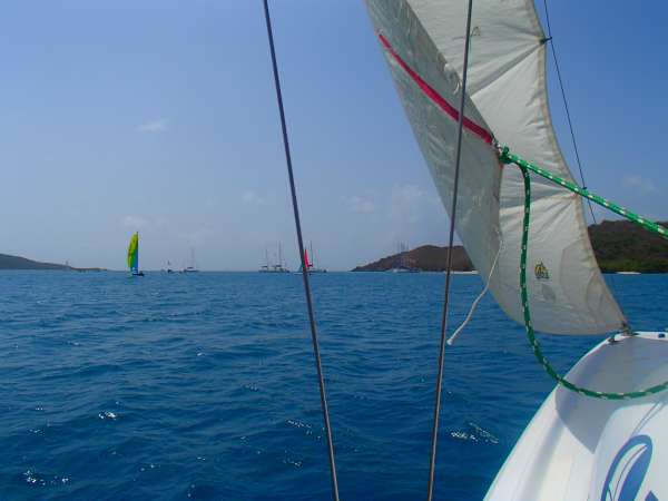 Today we got to take out a mini-sailboat. Everyone took turns going out in small groups to learn the finer points of controlling a sailboat and practiced man-overboard drills as well. After lunch, those of us who had already gone out were able to go to the beach, pairing off to sail around with another kind of small sailboat called a Hobie-cat, which is a smaller version of a catamaran. Once we were all done at the beach, we came back to Ocean Star to shower and got dressed up for our first night out. Before heading to the restaurant, we stopped by the beach and ate some BBQ with the action quest crews. Coming back to the ship, we were all wiped out, and everyone was asleep within minutes of each other.