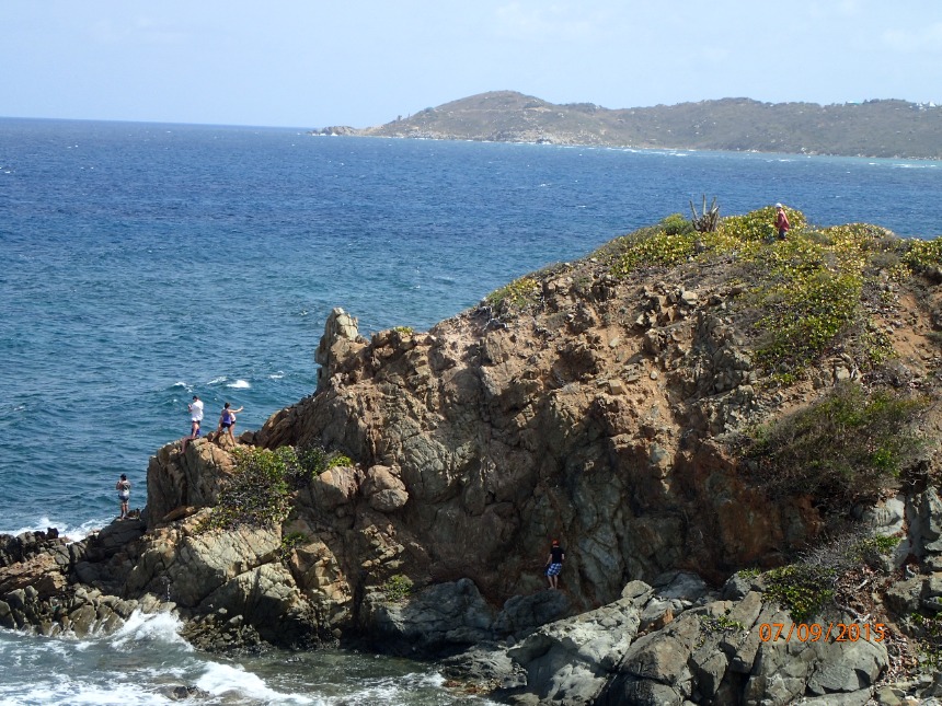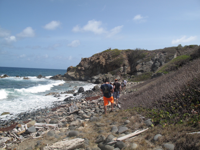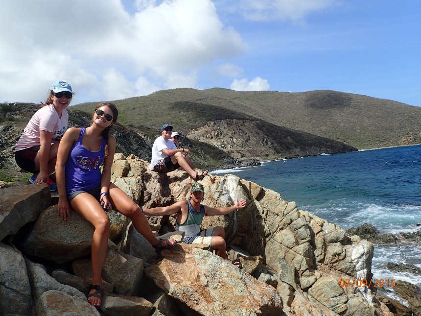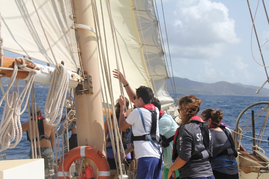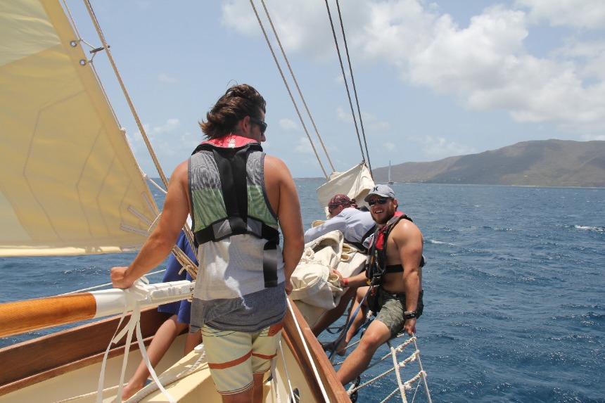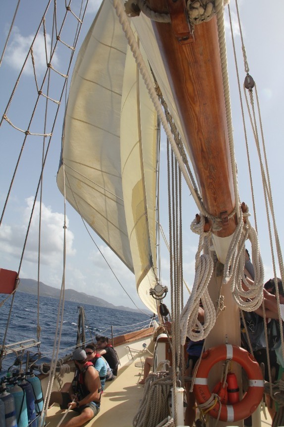 The day focused on sailing. Following breakfast, we removed the sail covers, performed too many maneuvers with the rigging to remember, and finally, for the first time, raised the sail. The four sails snapped eagerly in the wind; they were as eager to get underway as we were. We cast off from Peter Island mid-morning on choppy waters. During the 2-hour sail to Savannah Bay, the ship bucked and heaved like a mechanical bull, and several of the crew became intimately acquainted with seasickness. By noon, we had sailed past the deepwater of Peter Island to the shallows of Savannah Bay, and we were greeted by the magnificent beauty of the Caribbean. We anchored in about 18 feet of water, so clear we could see not only the anchor but the fish swimming curiously around it. The beach almost glowed with a turquoise light I had never seen before. This was the Caribbean you see on the front of magazines or in real estate ads.