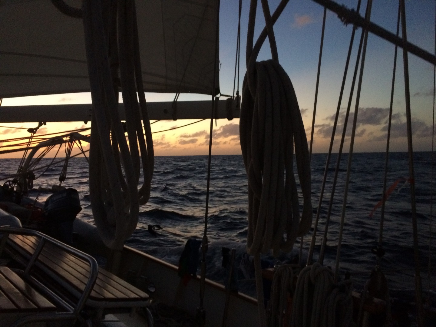 The 18 days at sea have seemed to all mash together, but today was a special one because we are nearing the end, the home stretch, of our long voyage. We woke up to a lunch of flatbread sandwiches and fries made by Cole, Lex, and Ev. The lunch was accompanied by the best homemade bread we have had so far, made by Dan. After lunch, we had our third marine bio exam with Amy. Then we had our first CPR class with Tina, who dropped some serious knowledge as well as entertaining medical stories. We are looking forward to completing our Emergency First Responder certification next week. After classes, everyone spent some time hanging out and watching movies to relax from all the studying that took place over the last couple of days. We also had deck showers this afternoon. We can tell we are getting close to the Caribbean because the weather is getting hotter, so we find the showers refreshing now instead of brisk and chilly like early in the crossing. Everyone’s spirits were high at dinner tonight because of the tasty shepherd’s pie and due to the increasing number of boats we are seeing and the low flying planes heading in the same direction we are. We have discussed recently that those planes take mere hours to go the same distance we have sailed in the past few weeks, but we all agree that we would not trade our crossing for any other type of travel. We are continuing to follow the routine of our watches while we count down the miles until Dominica.